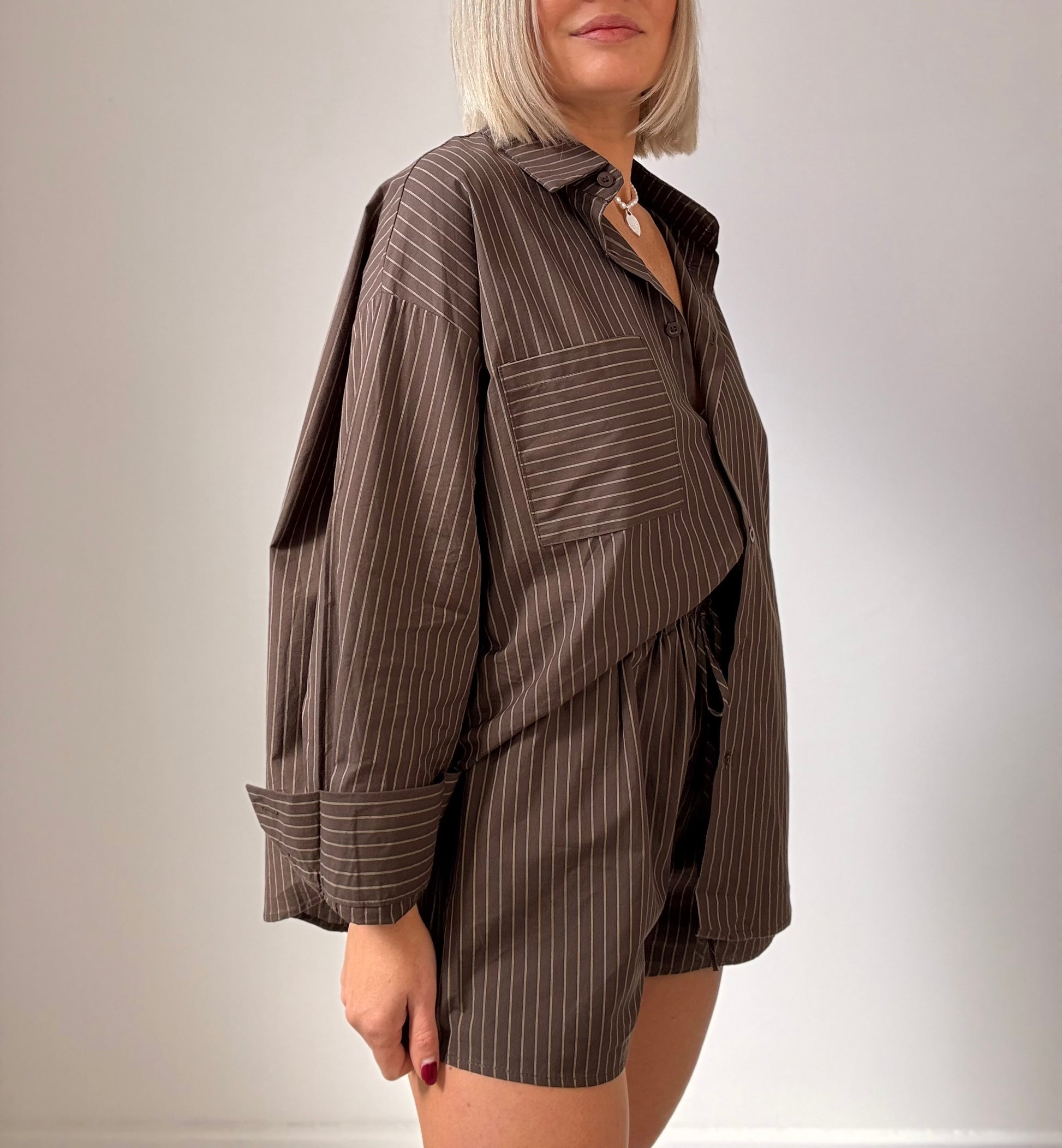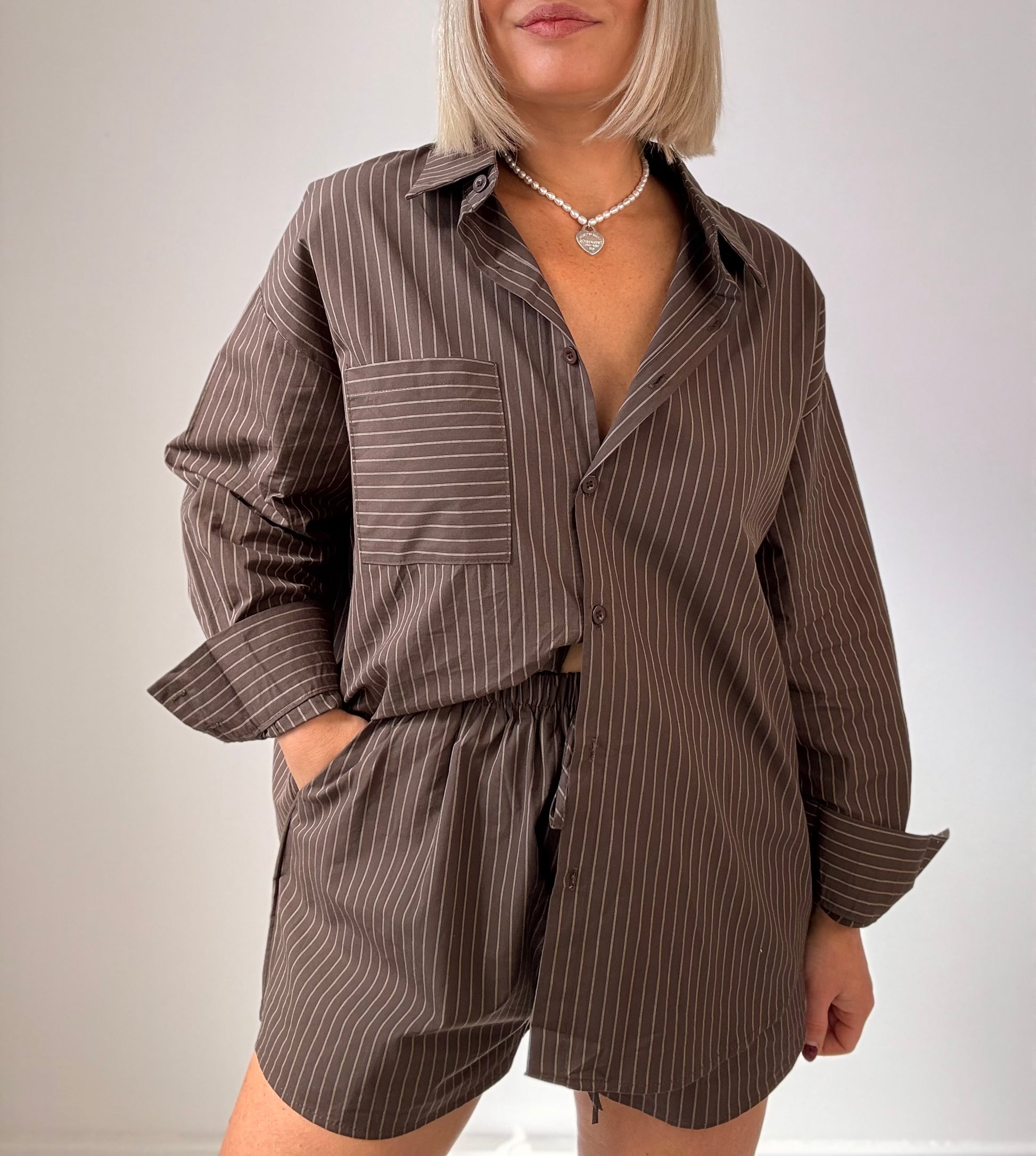 This Amara stripe short set includes an oversized shirt with a collared button design, paired with matching shorts that feature a convenient drawstring. Stay comfortable while looking effortlessly stylish in this versatile and practical set. Perfect for lounging or running errands, the Amara set is a must-have addition to your wardrobe.