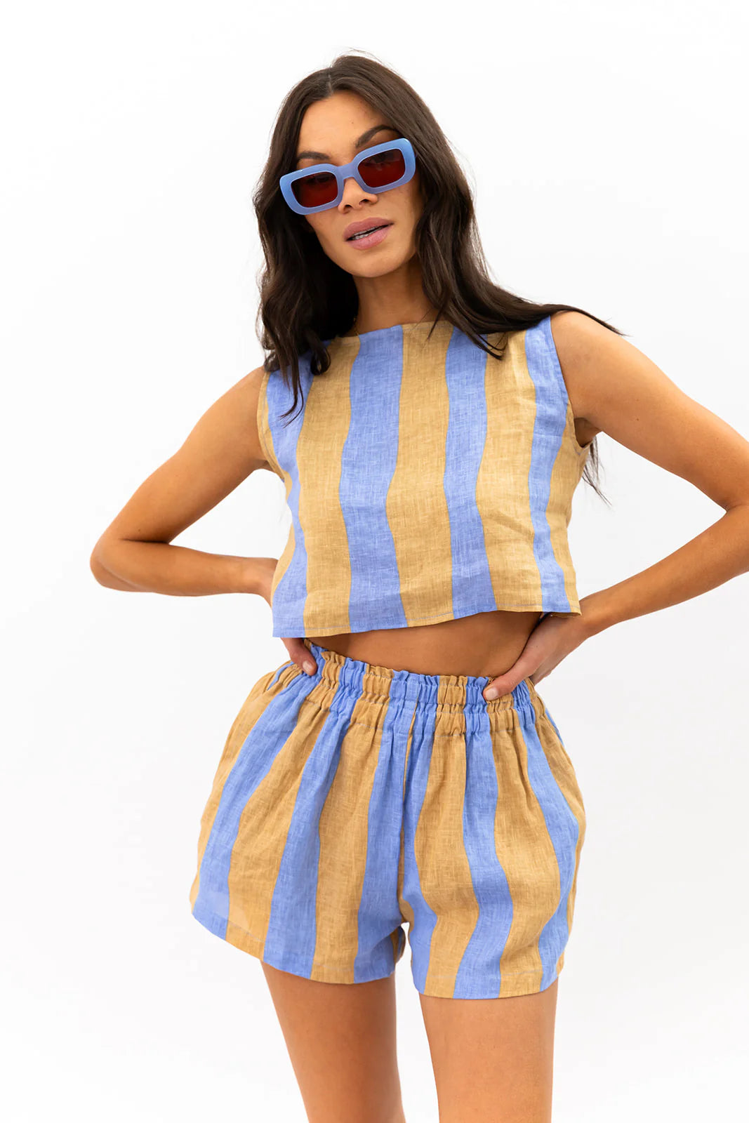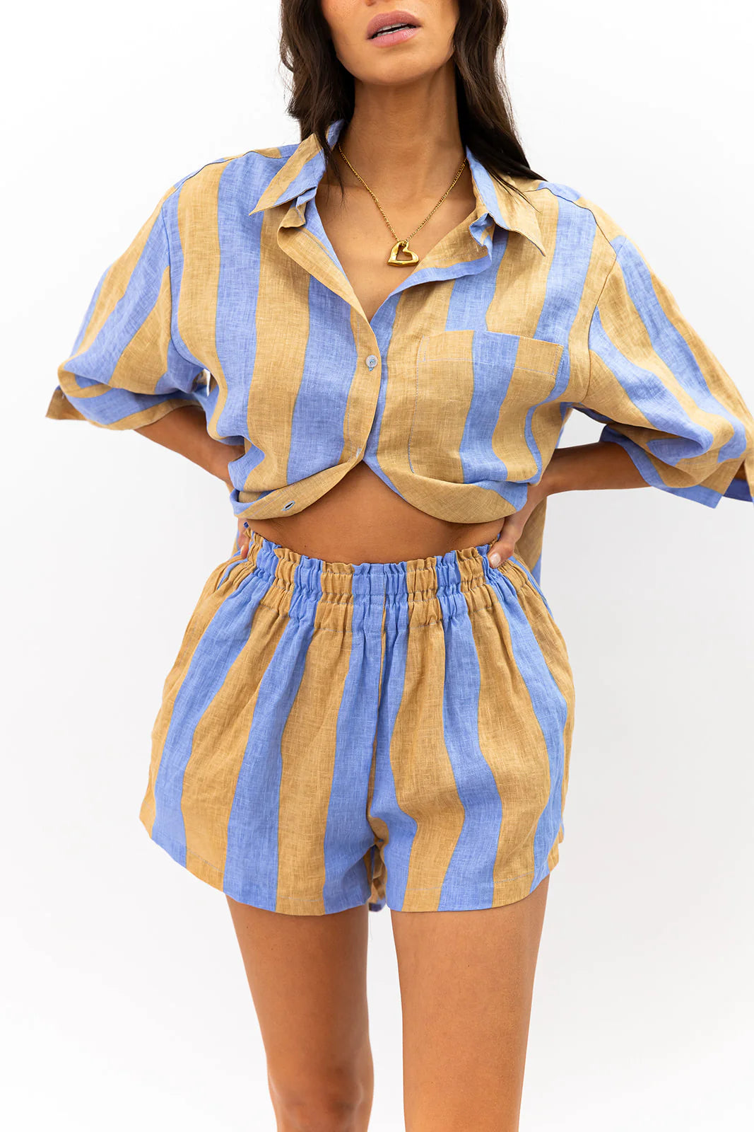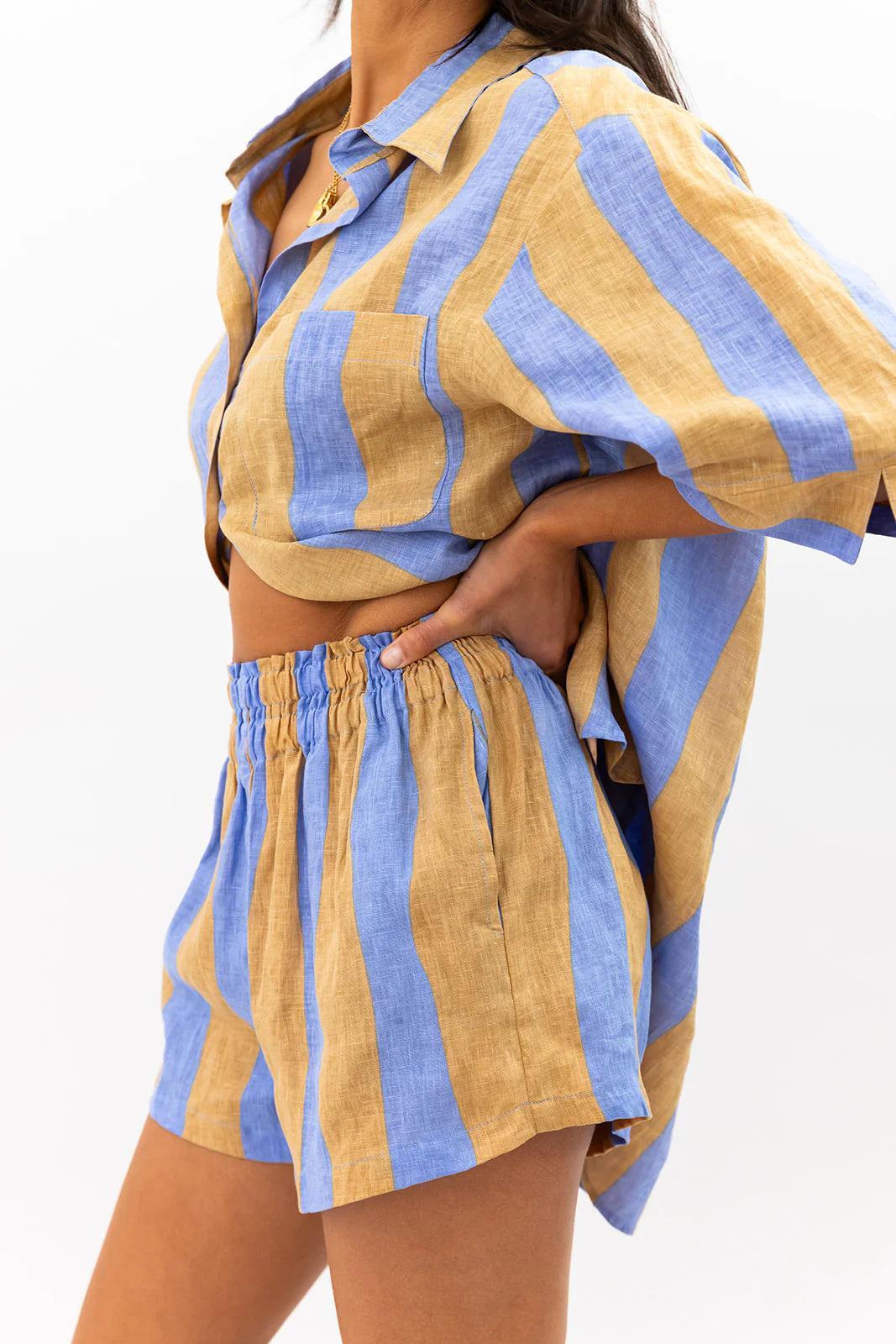 The Antigua Shorts are an effortless, easy to wear staple for your summer wardrobe. Cut from a crisp, lightweight Cotton Linen and hand-dyed in our exclusive prints and colours. Featuring a shirred elastic waistband and offering a relaxed fit, the Antigua Shorts pair back perfectly with the Sumba Shirt or thrown over your favourite swim.