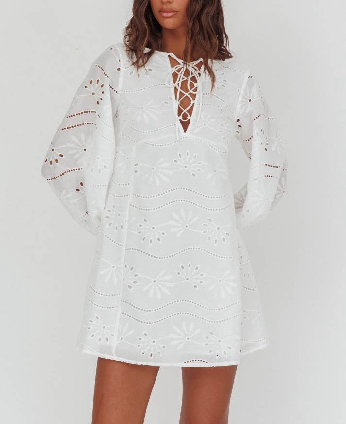 The Belle Dress features a charming tie front detail and a boho style, perfect for a relaxed and effortlessly stylish look. With a loose fit and a-line design, this dress offers comfort and flattering silhouette. Elevate your wardrobe with this must-have addition.