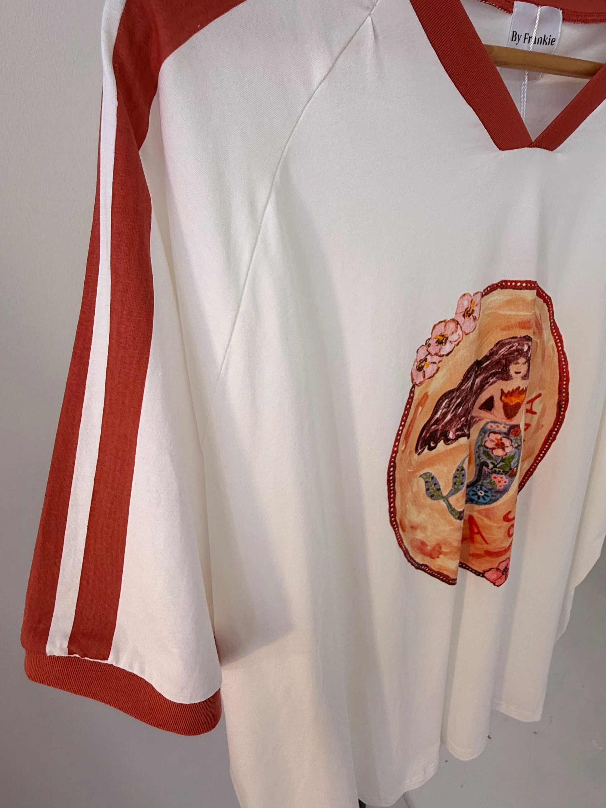 The La Sirena Tee boasts racer sleeves and an oversized fit, creating a stylish silhouette. Its V-neck detail adds a touch of sophistication to this casual piece. Dare to make a statement with this comfortable and trendy T-shirt.