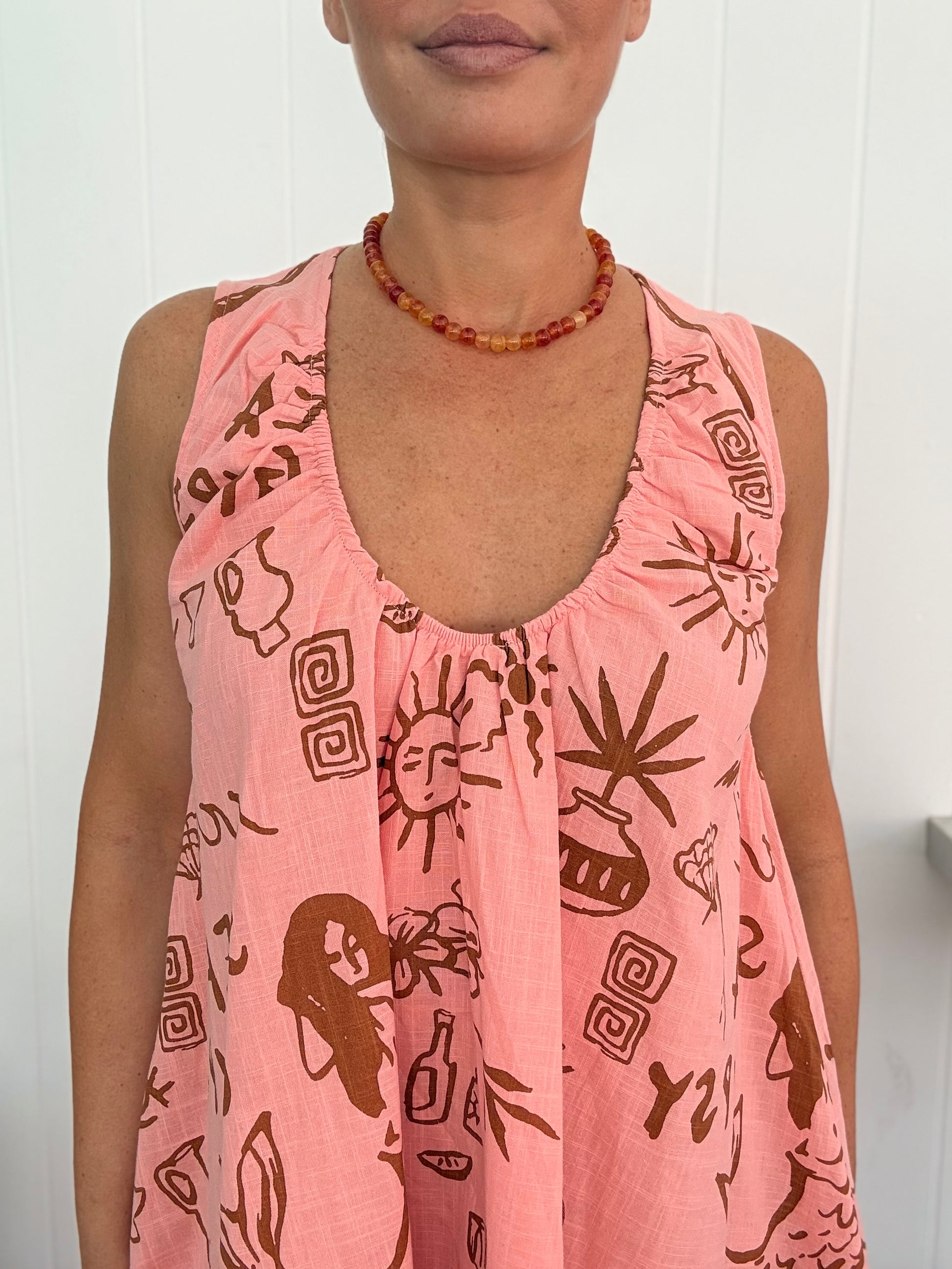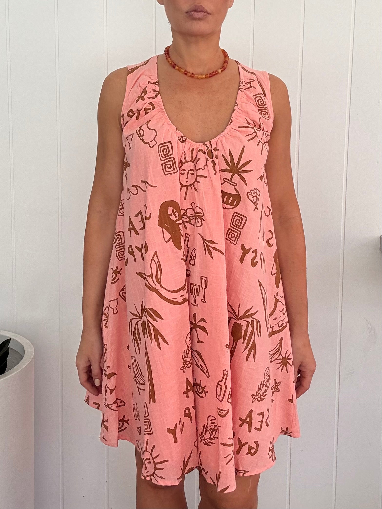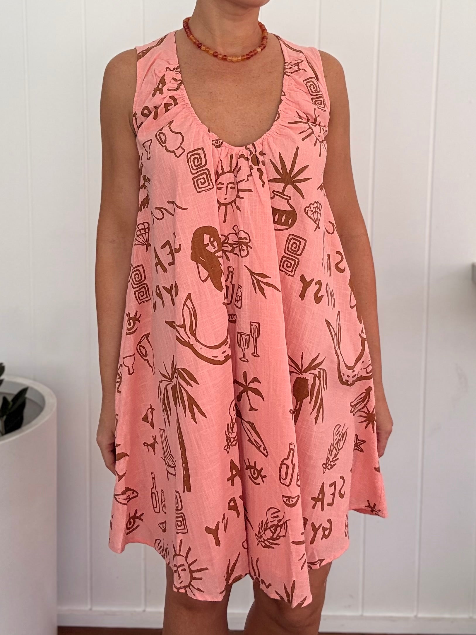 Experience the perfect summer look with By Frankie/ Sea Gypsy's Salmon Sun dress. Featuring a gathered scoop neckline and lightweight design, this dress is both stylish and comfortable. Stay cool and chic while enjoying the sunny weather in this lined sun dress.