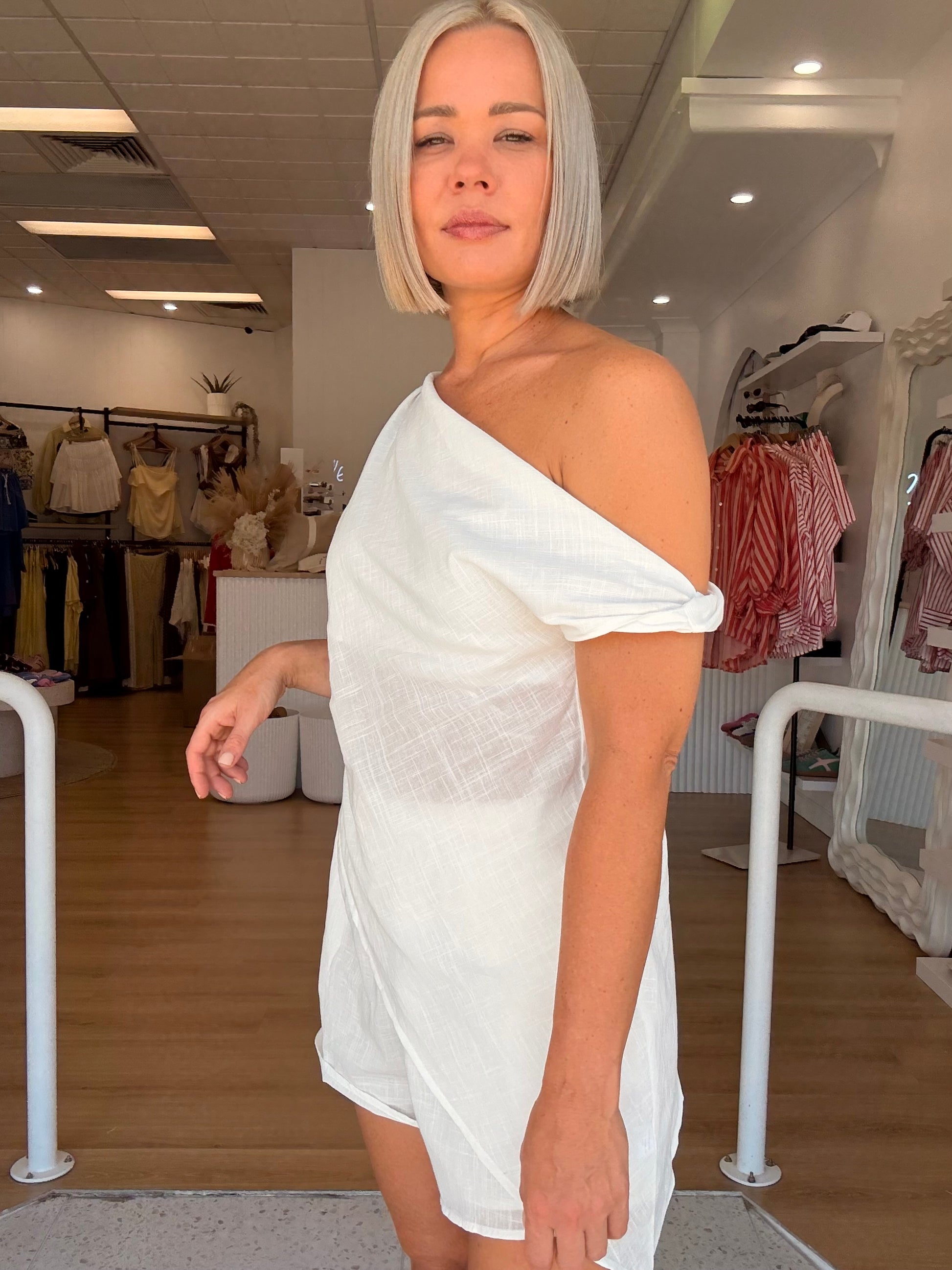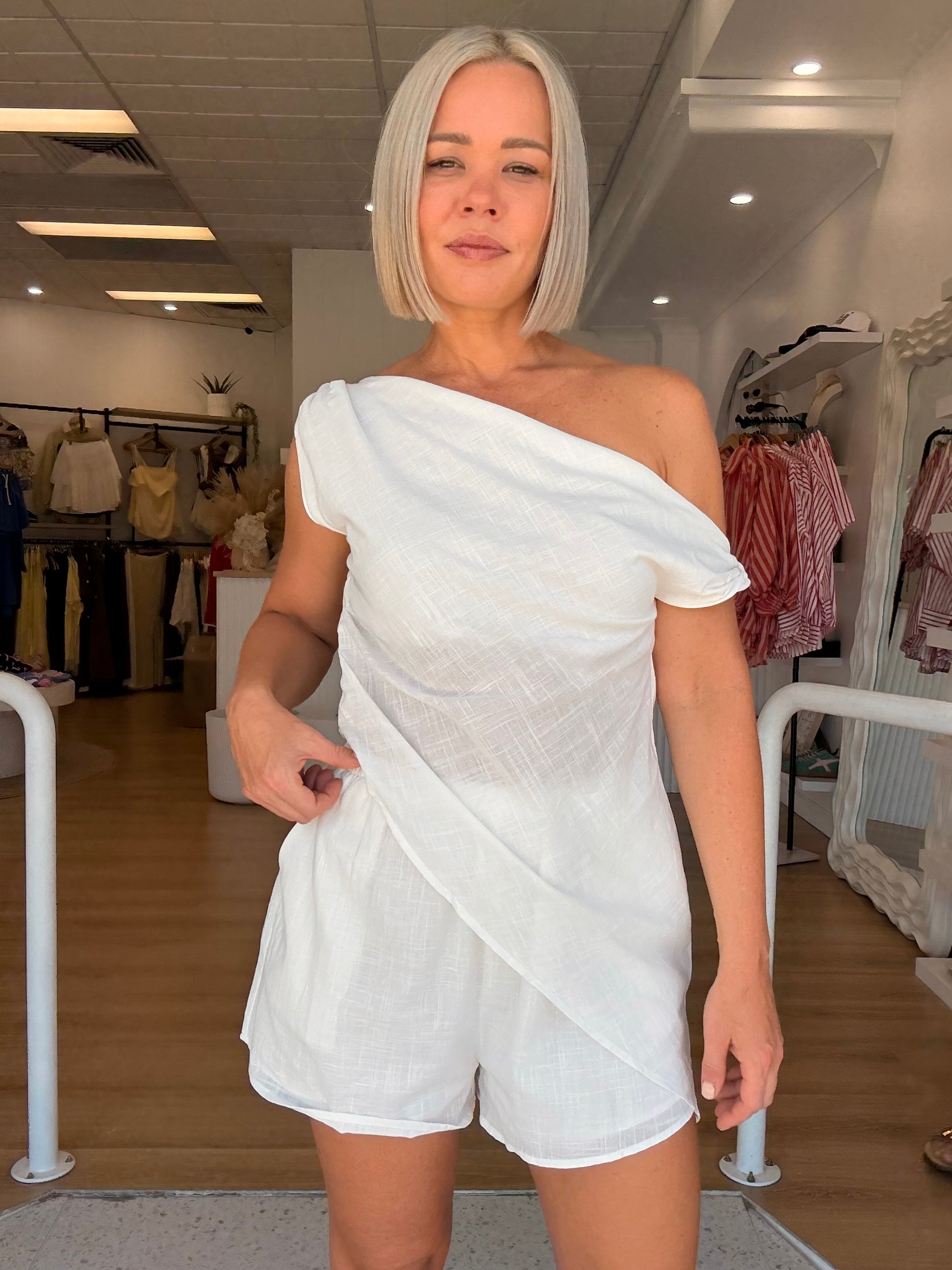 "The By Frankie/ Rome Short Set in White offers a stylish and functional ensemble. The asymmetrical top features a zip side closure, while the lightweight fabric provides comfort. The shorts are equipped with pockets and an elastic waist for convenience. The perfect choice for a chic and effortless look."