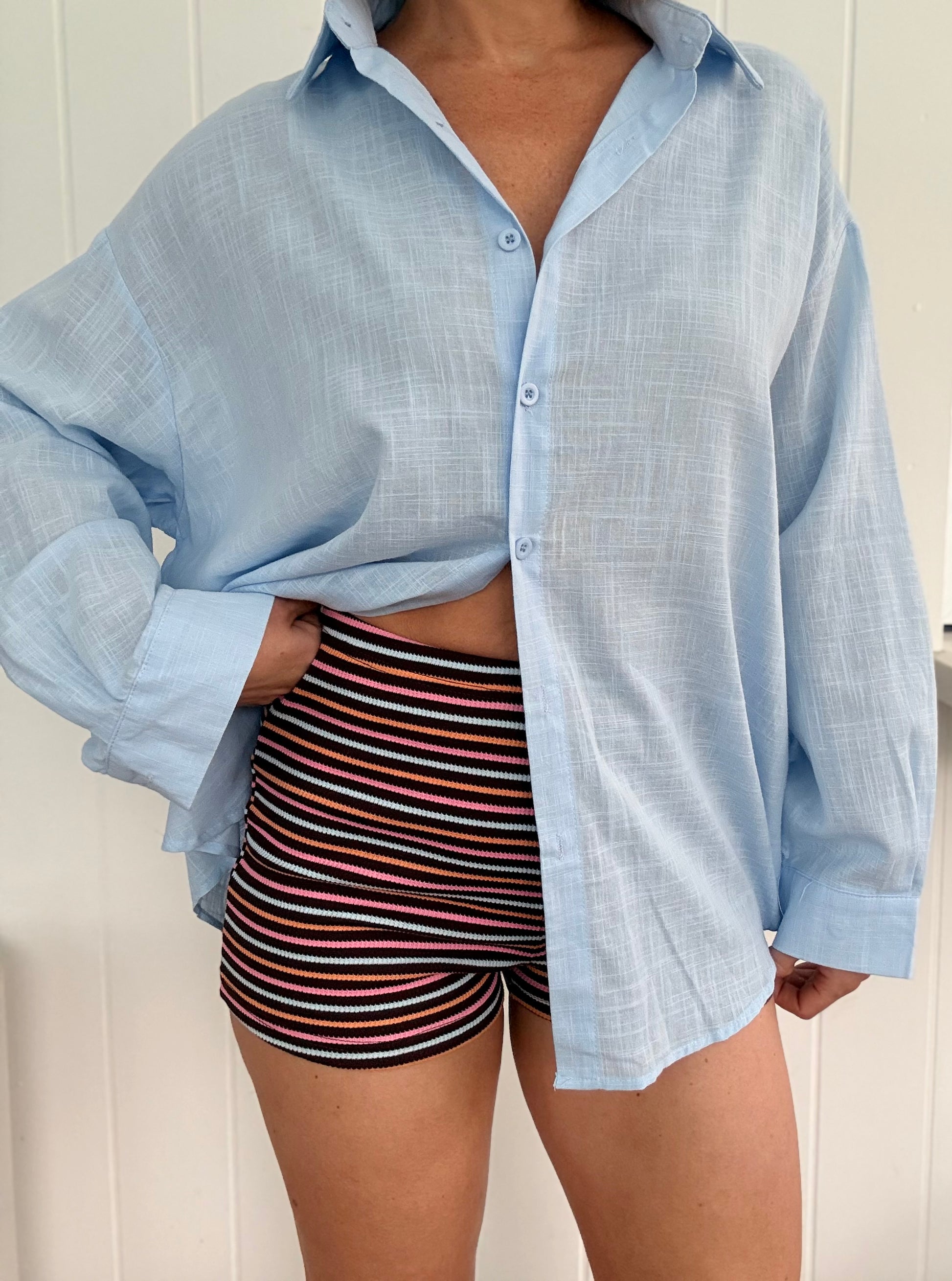 Effortlessly stylish and comfortable, the By Frankie Boho Blouse in Blue is a must-have addition to your wardrobe. The loose fit and button up design provide a trendy look, while the lightweight fabric ensures all-day comfort. Pair it with our knit shorts for a fashion-forward ensemble.