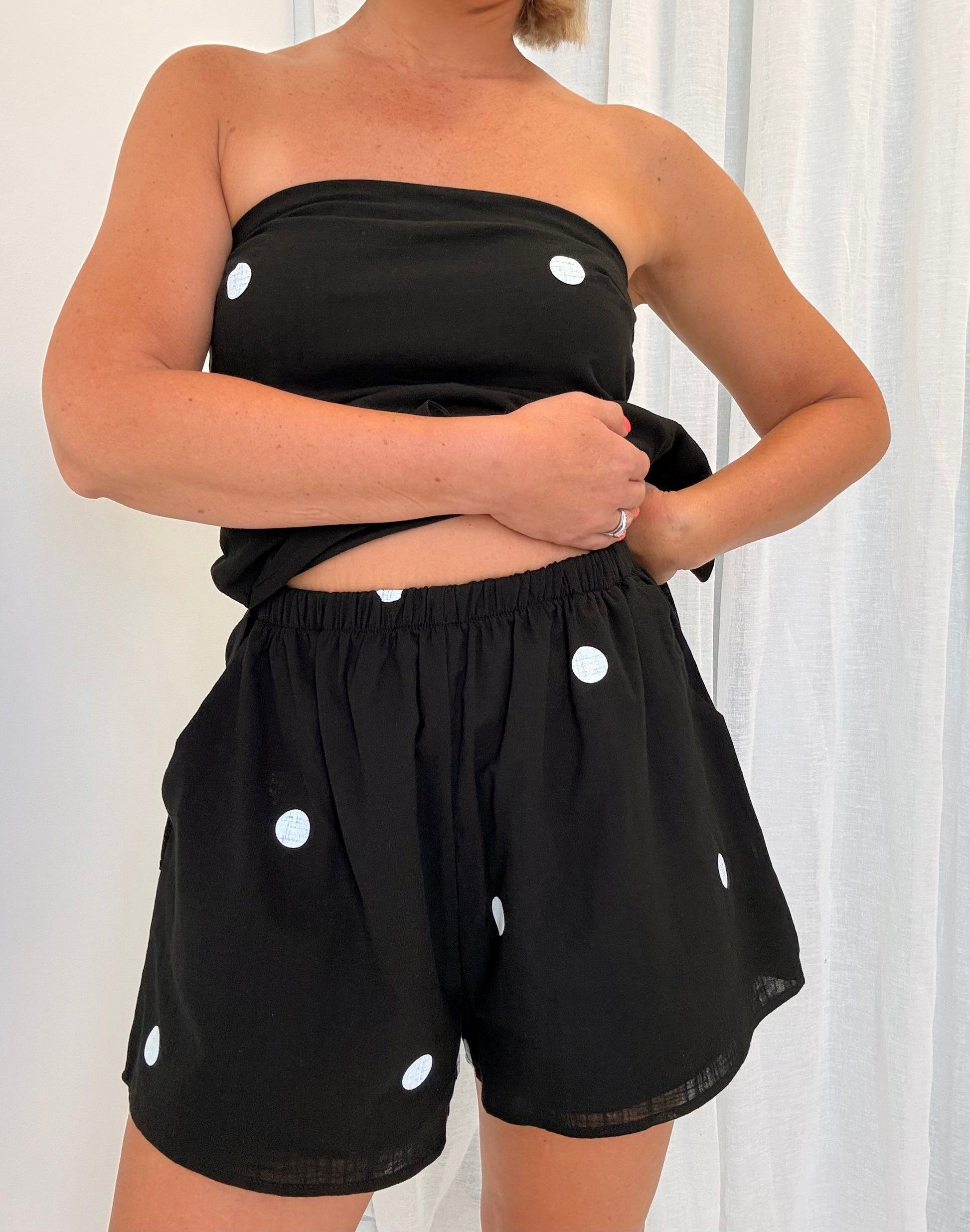 Elevate your summer wardrobe with the By Frankie/ Billie Strapless Set in Black/White. This versatile set features a strapless elastic back top and shorts with pockets and a flattering polkadot design. The elastic waist ensures a comfortable and stylish fit. Perfect for any occasion, from casual outings to dressier events.