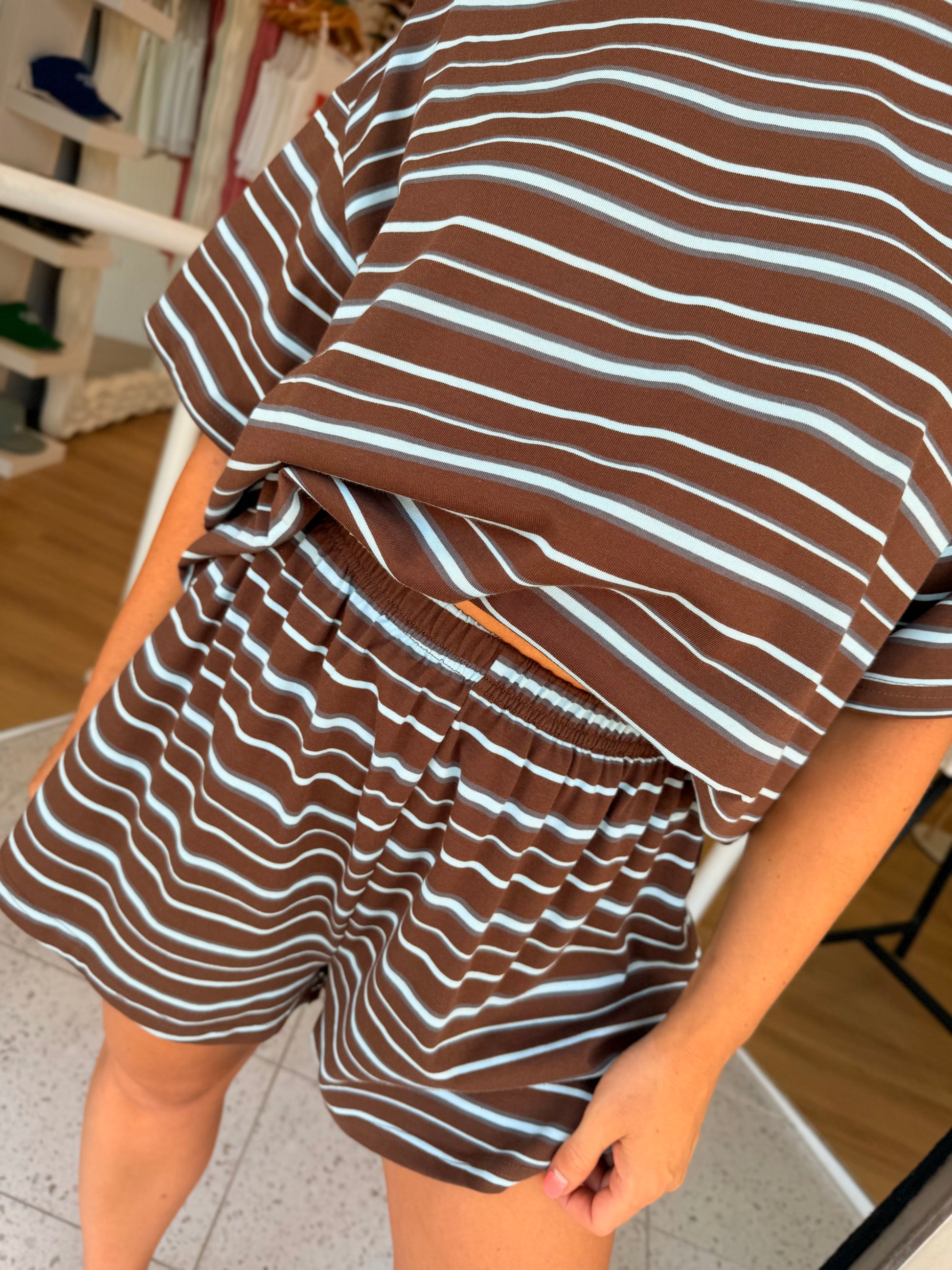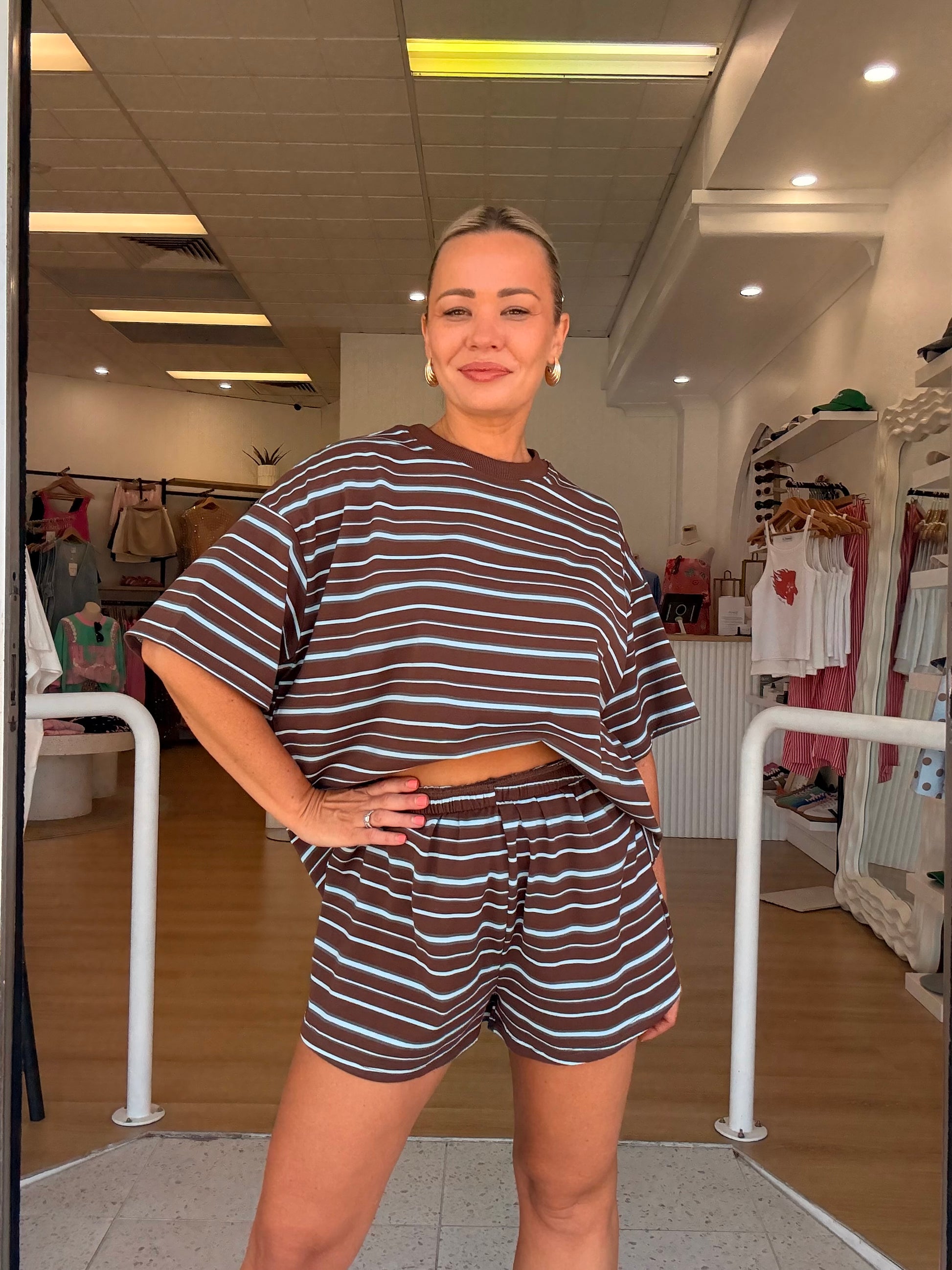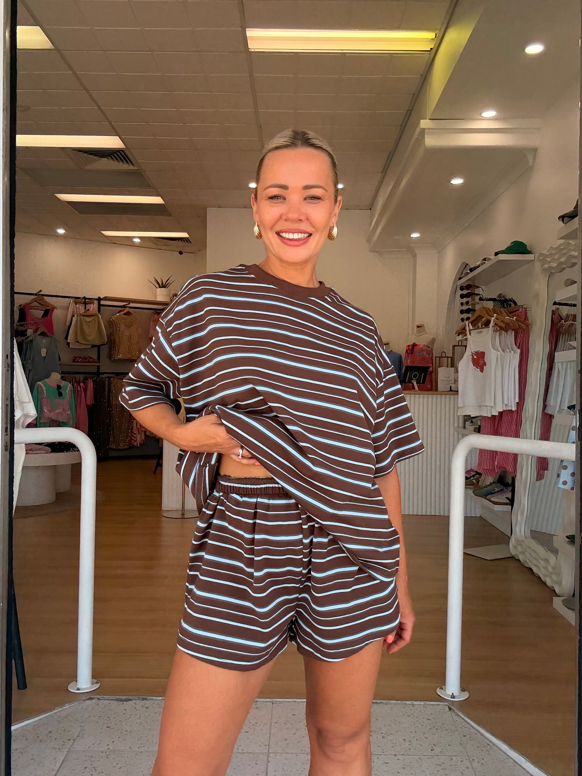 The By Frankie Hallie Set in Choc/Blue is crafted from 100% cotton, ensuring breathability and comfort. The lightweight tee features a brown-edged neckline, while the shorts include functional pockets and an elastic waistband for a secure fit. This combination enhances mobility and ease of wear, making it ideal for casual outings.