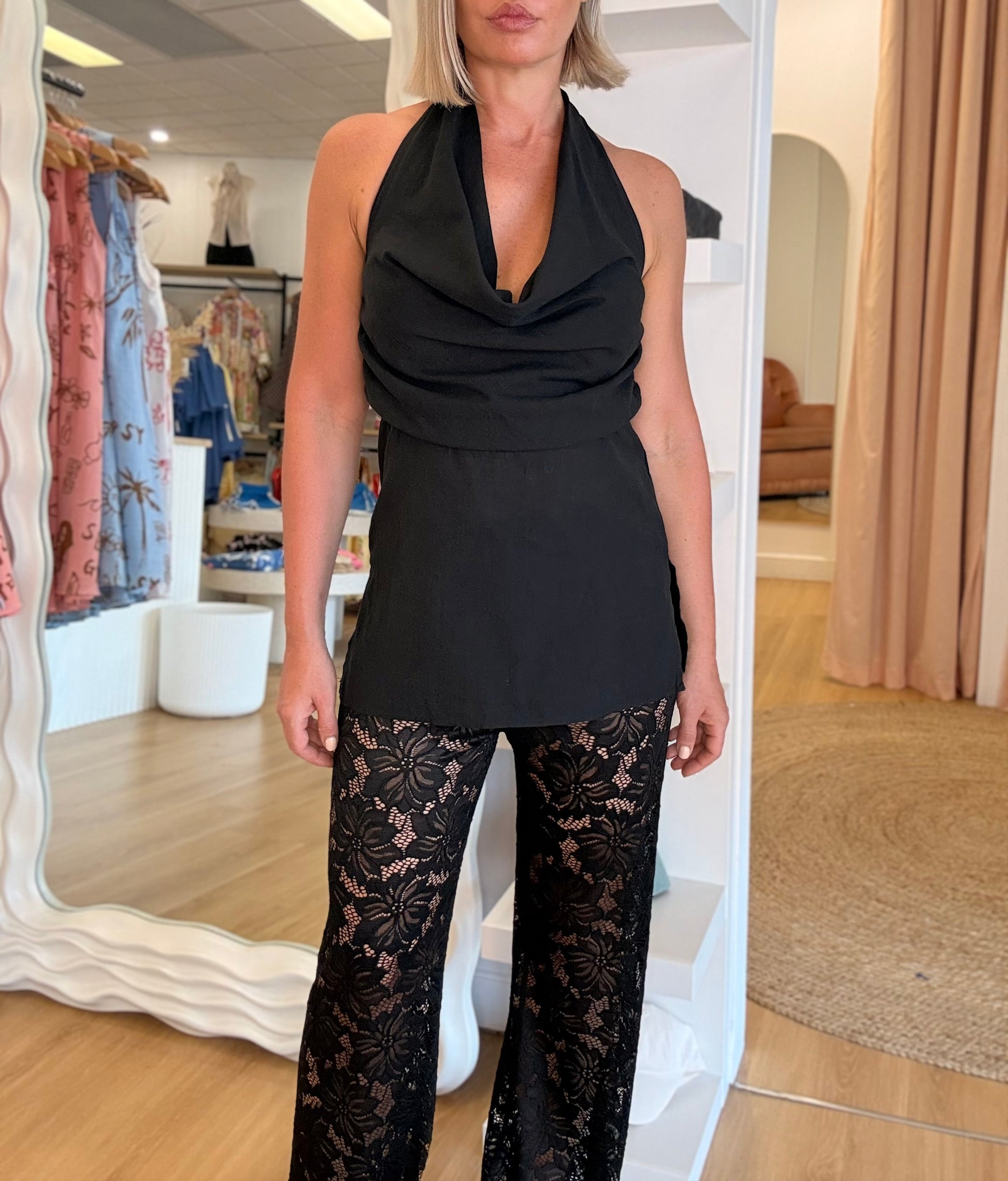 The By Frankie Halter Lace Pant Set in black offers a stylish and effortless look. The gathered detail halter with tie neck tie provides a loose fit, while the 100% lace pants with elastic waist band offer comfort and coverage. Perfect for a stylish and comfortable outfit