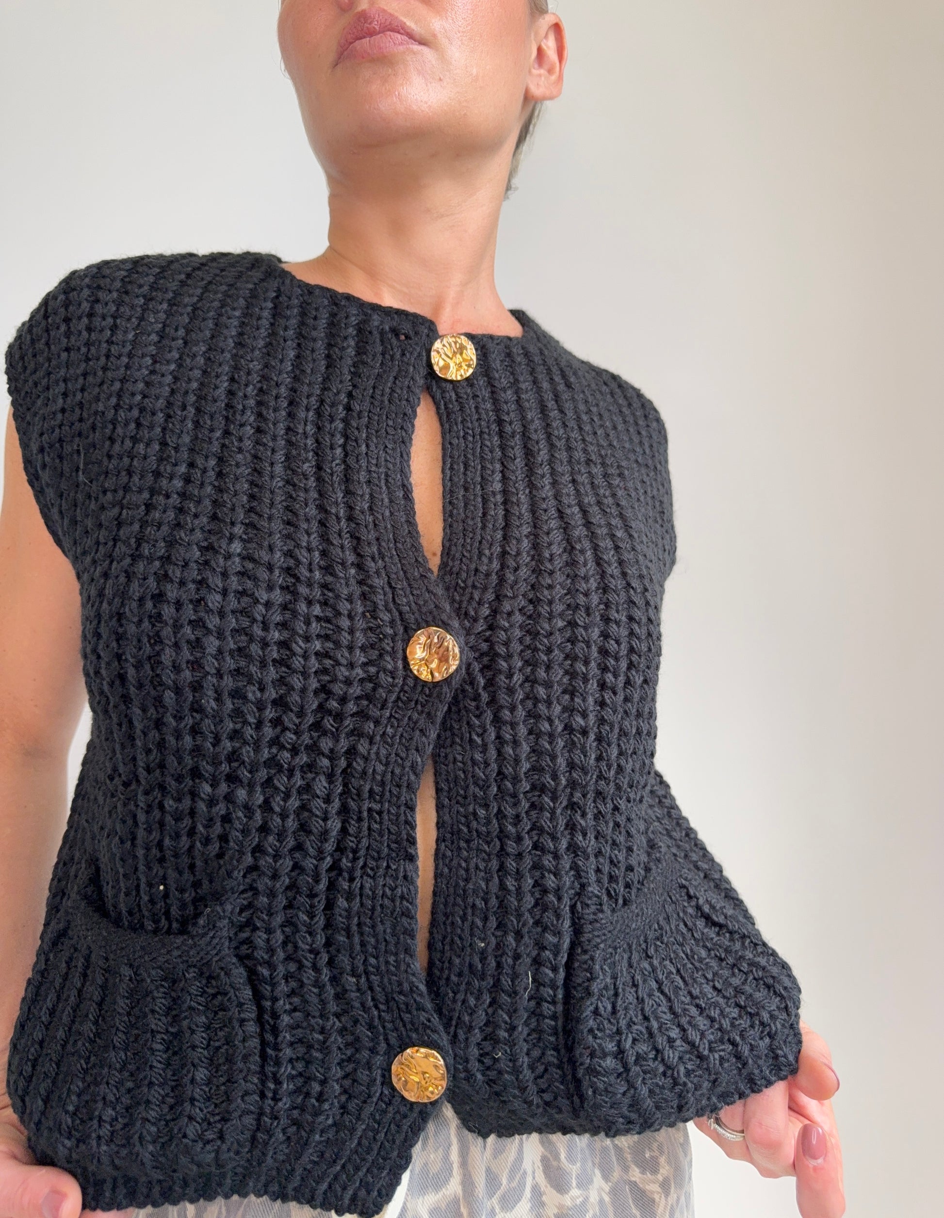 Expertly crafted, the By Frankie Knit Vest features a classic knit design and elegant gold button detail. Perfect for dressing up with pants, this vest effortlessly adds a touch of chic to any outfit. Upgrade your wardrobe with this versatile and sophisticated piece.
