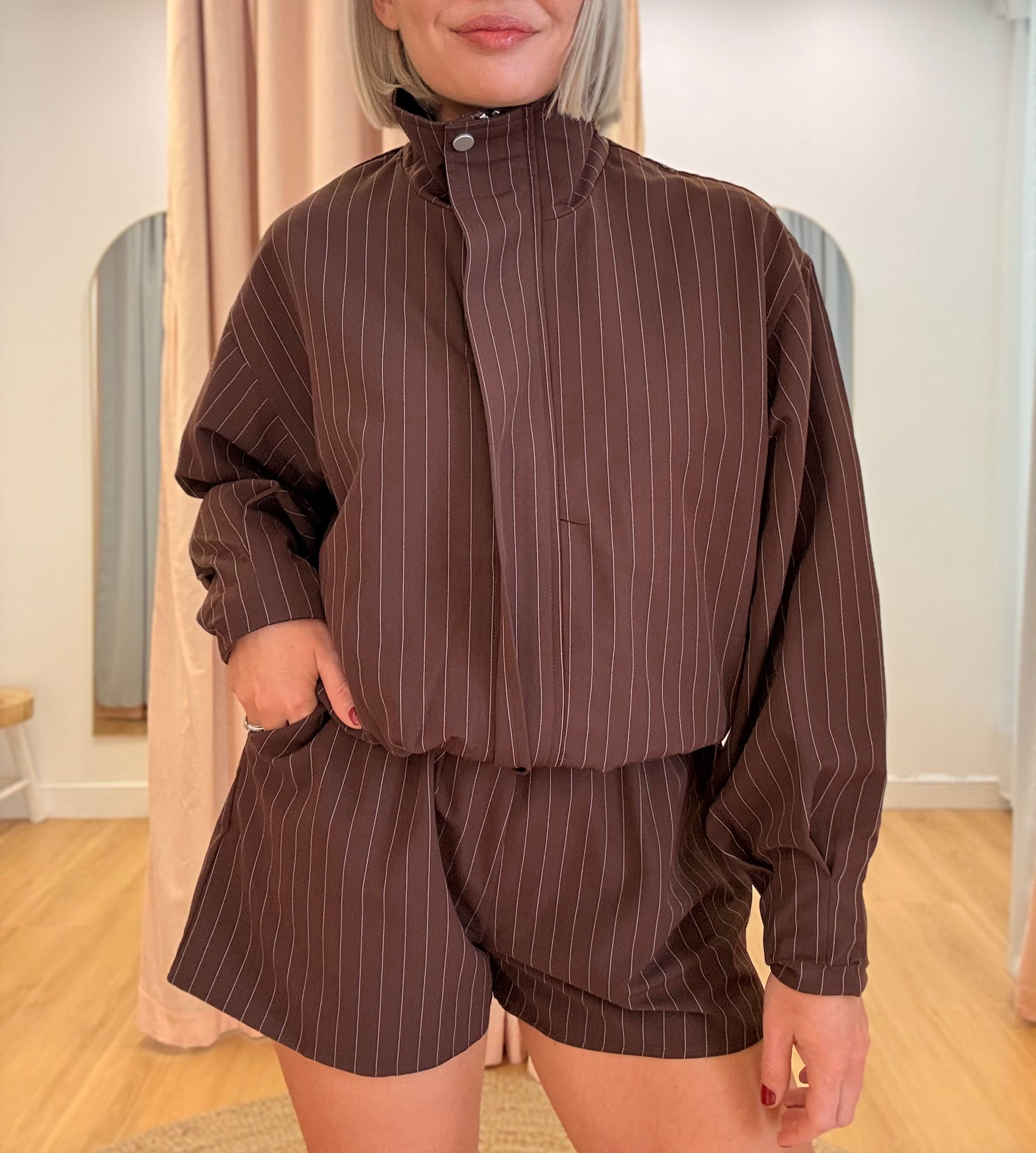 The By Frankie Marlo Bomber Short Set in Chocolate Pinstripe features a bomber jacket with button details and pleated sleeves, offering versatile styling options. The shorts include an elastic waist and pockets for functionality. This set is designed for autumn, allowing for mix-and-match versatility while maintaining a chic aesthetic.