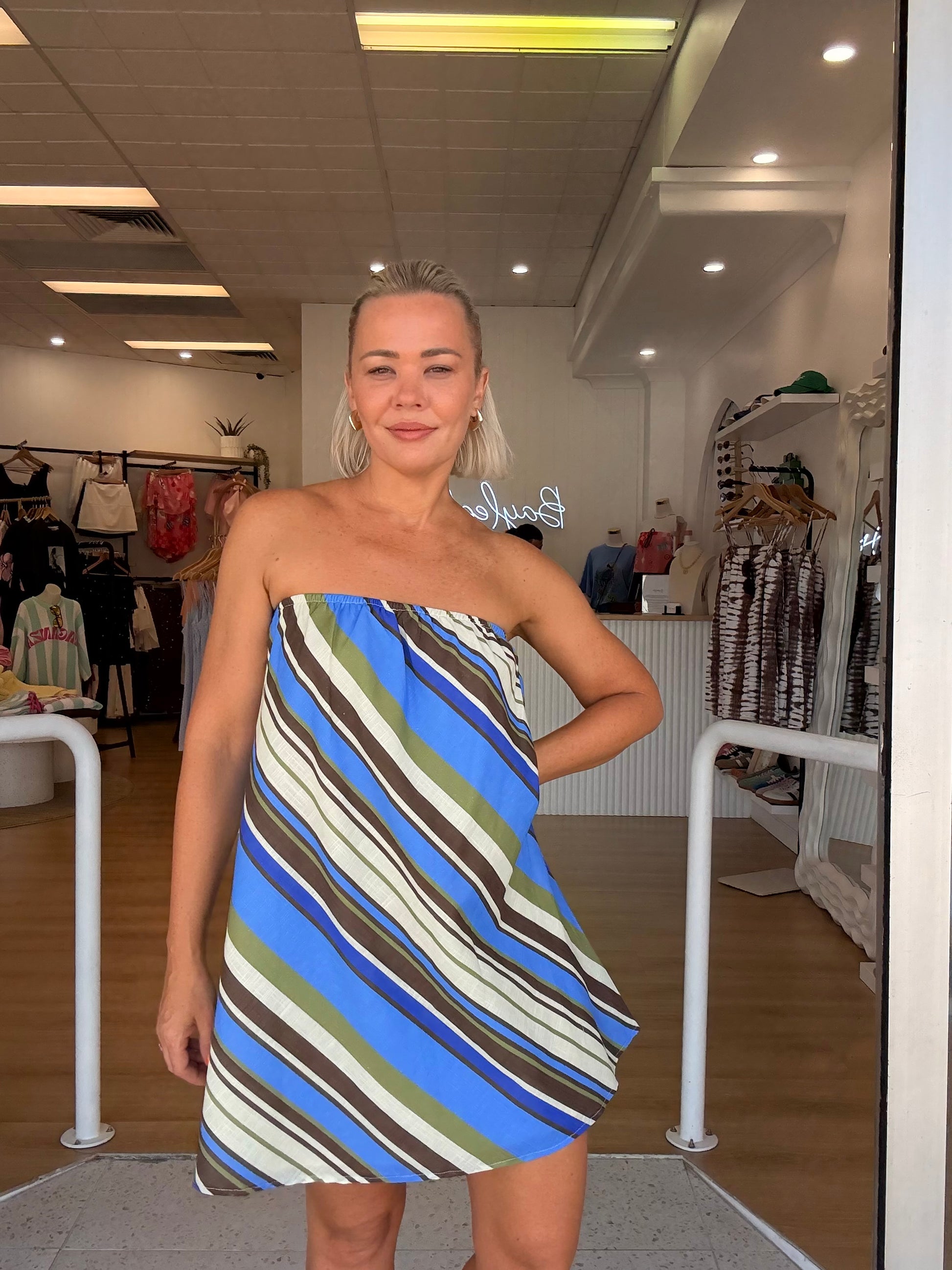 The By Frankie Moana Swing Dress features an elastic strapless design and a lightweight, striped fabrication. This dress offers ease of movement and comfort, making it a versatile addition to any wardrobe. Its slight flare enhances comfort while providing a flattering silhouette for varied body types.