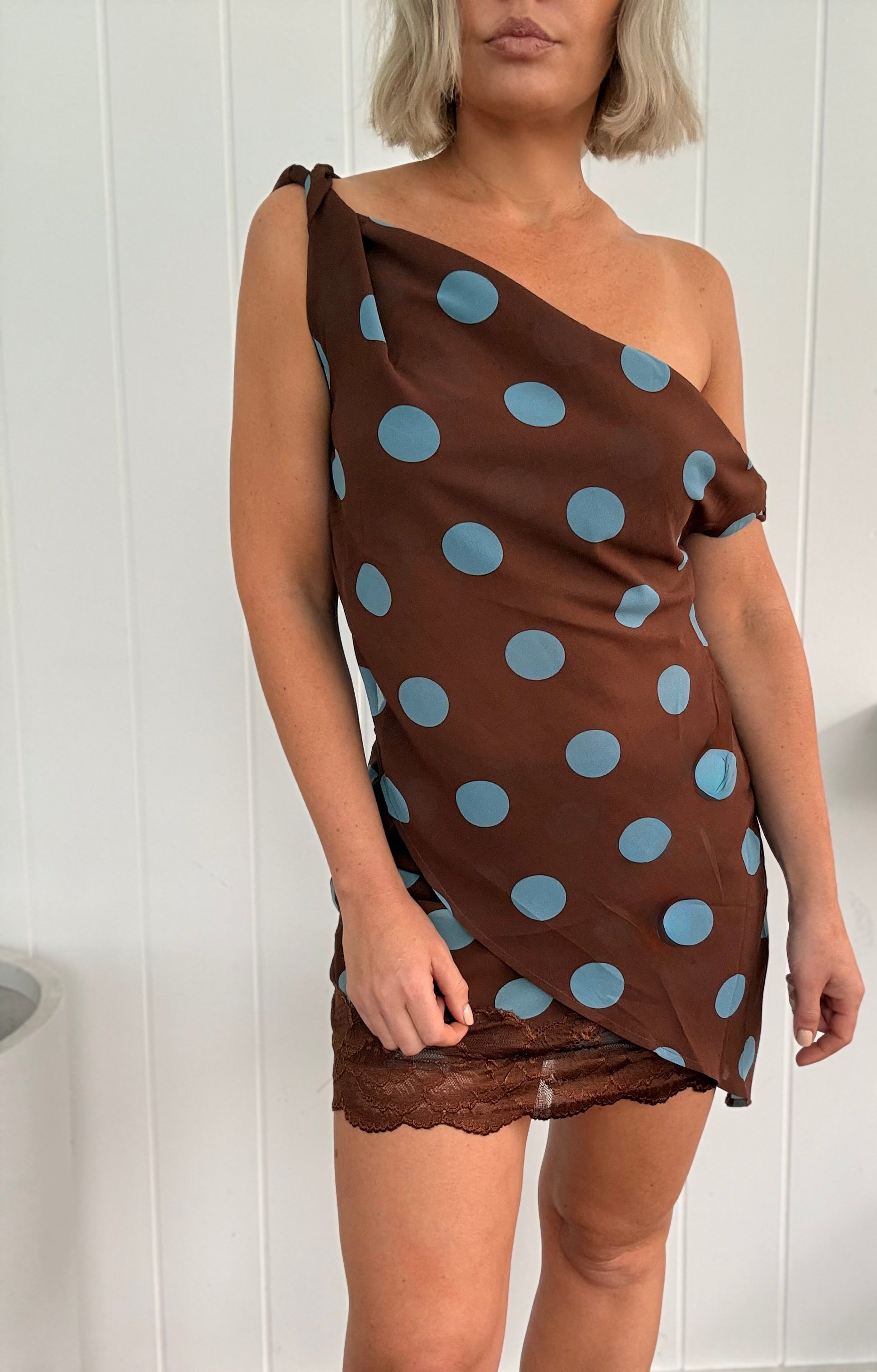 Expertly crafted with an asymmetrical design, this By Frankie Polka Dot Top offers a unique and stylish addition to any wardrobe. The off shoulder silhouette and side zip closure provide a modern touch, while the lightweight fabric ensures all-day comfort. Pair it with our Polka Dot Lace Skirt for a perfectly coordinated look.