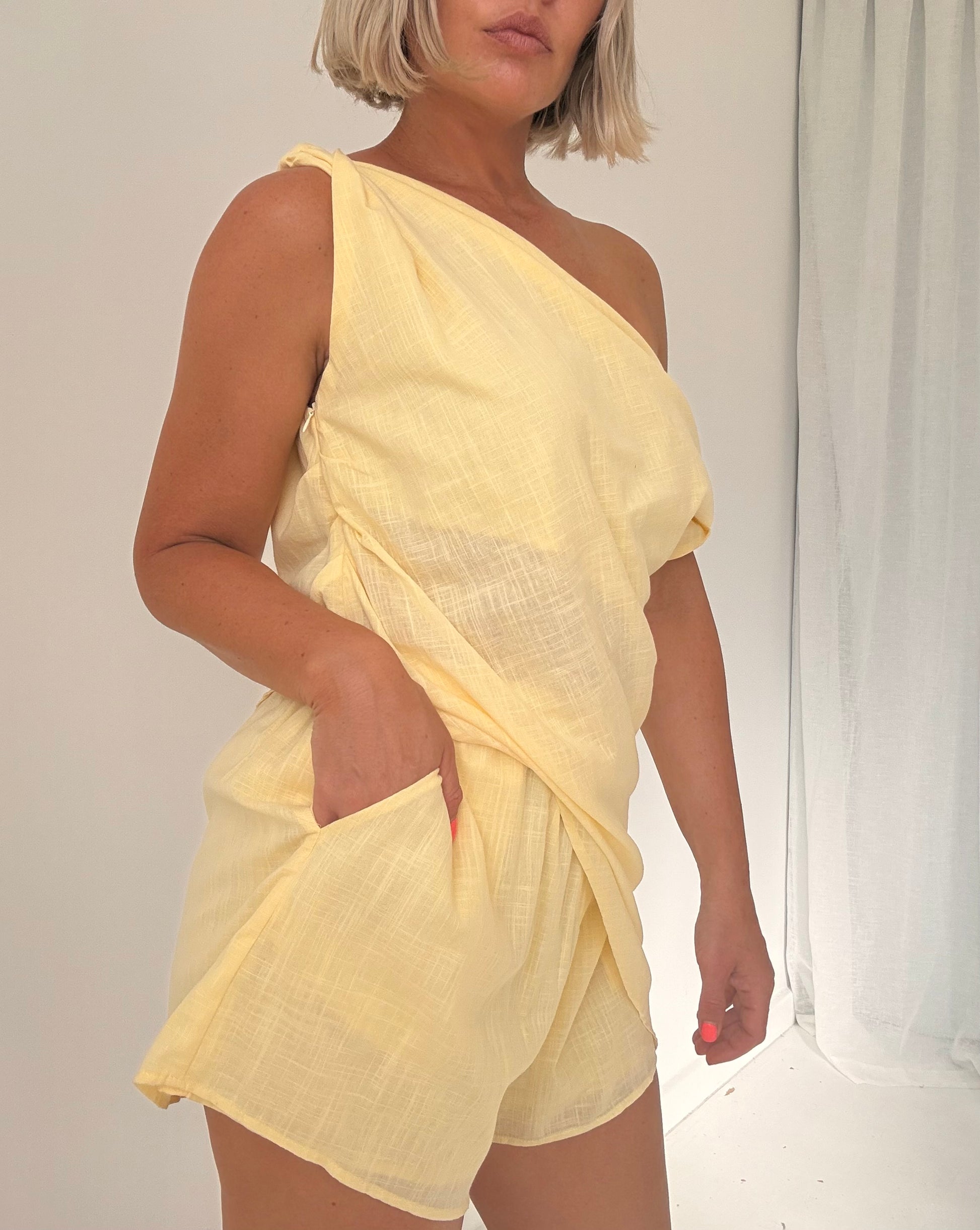 "The By Frankie/ Rome Short Set in Butter offers a stylish and functional ensemble. The asymmetrical top features a zip side closure, while the lightweight fabric provides comfort. The shorts are equipped with pockets and an elastic waist for convenience. The perfect choice for a chic and effortless look."