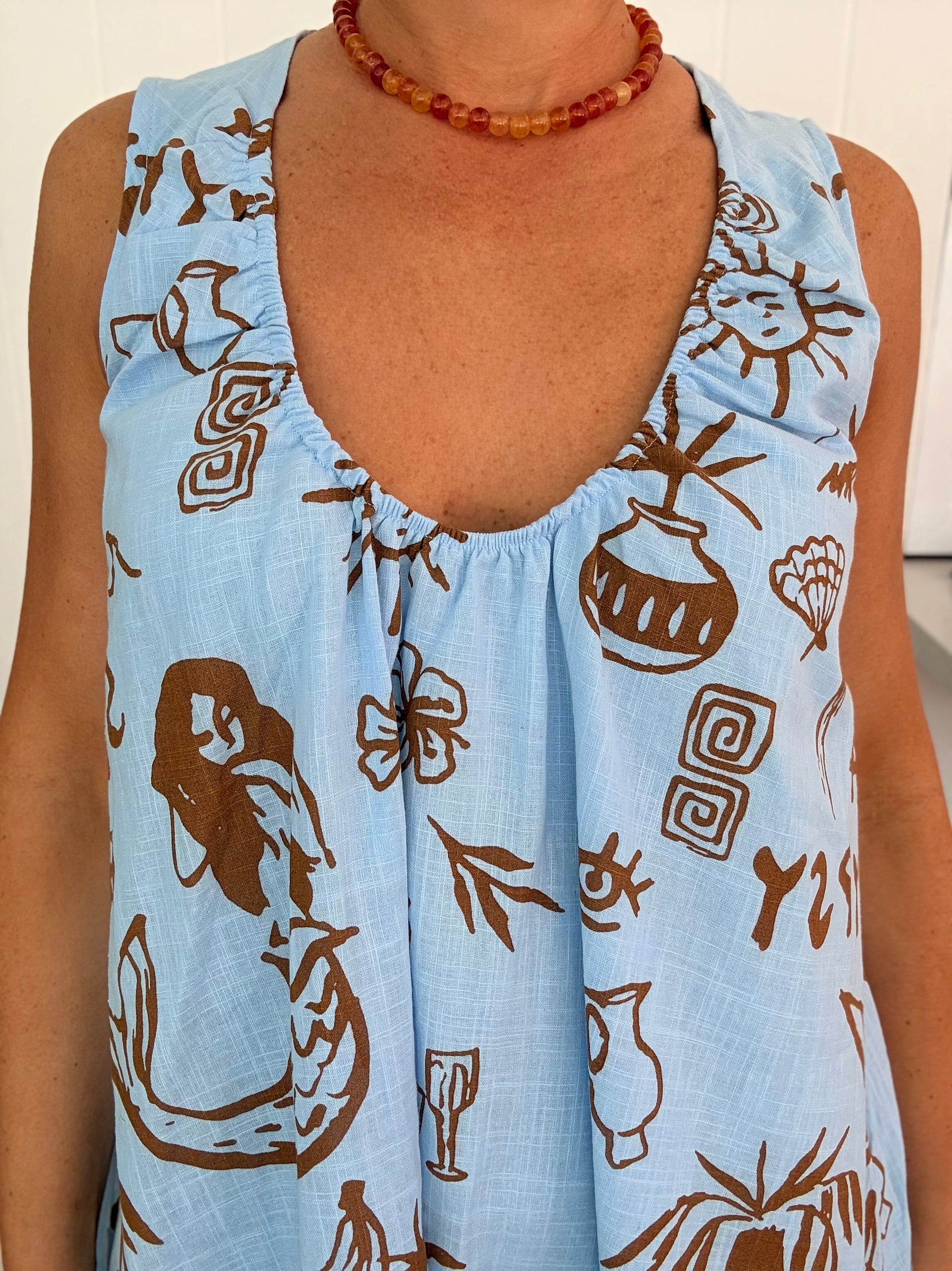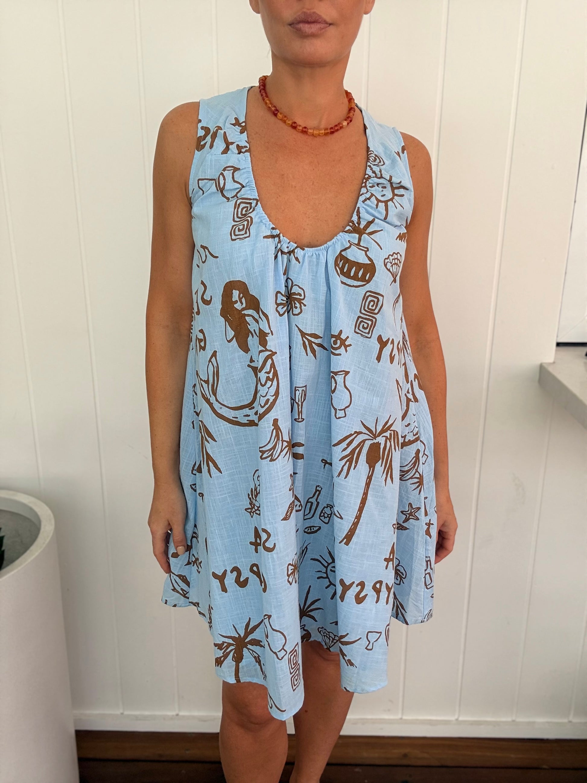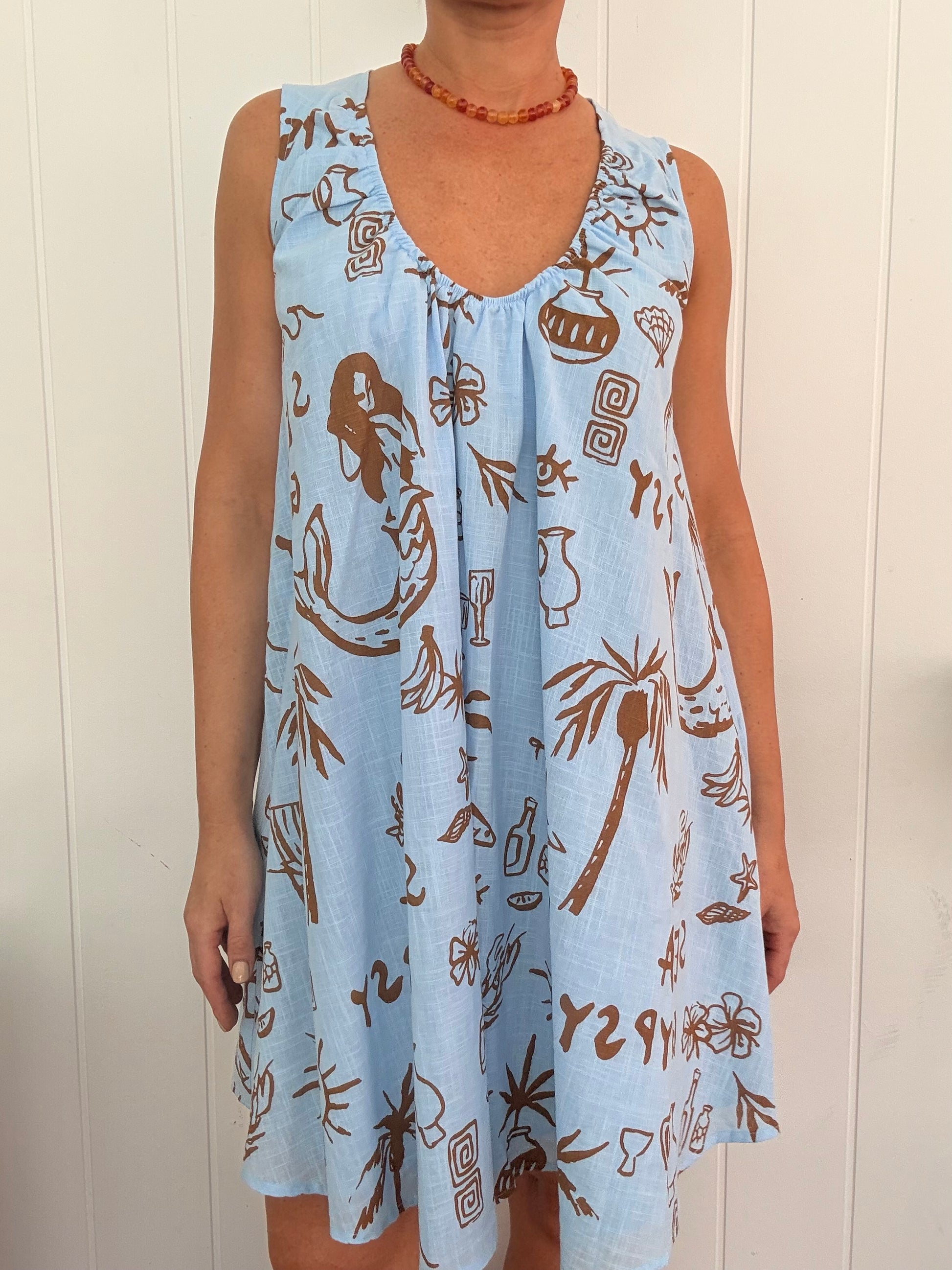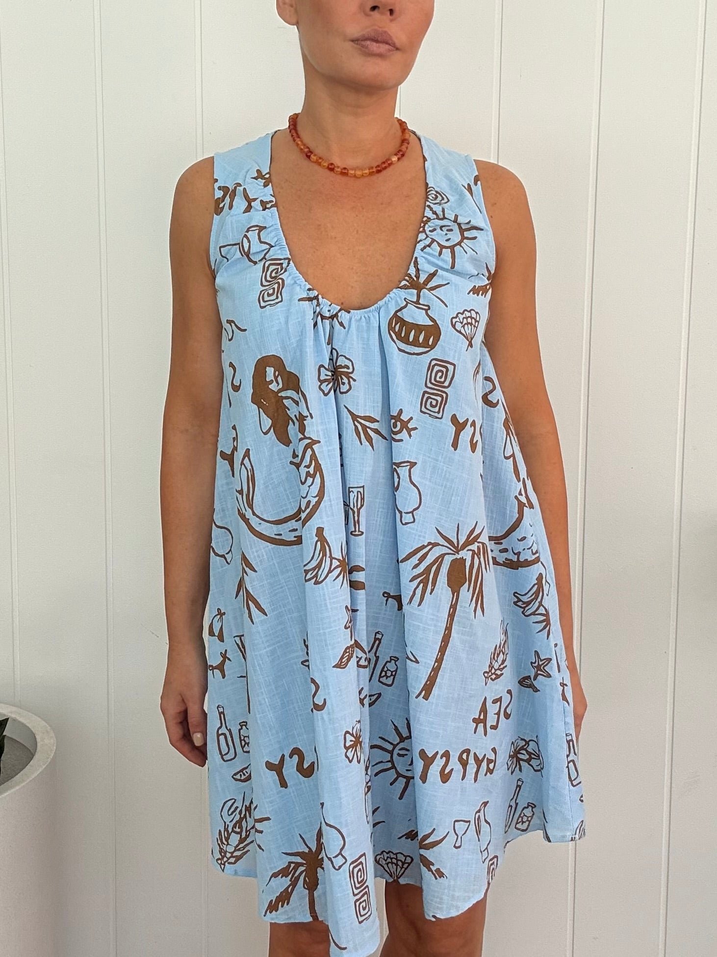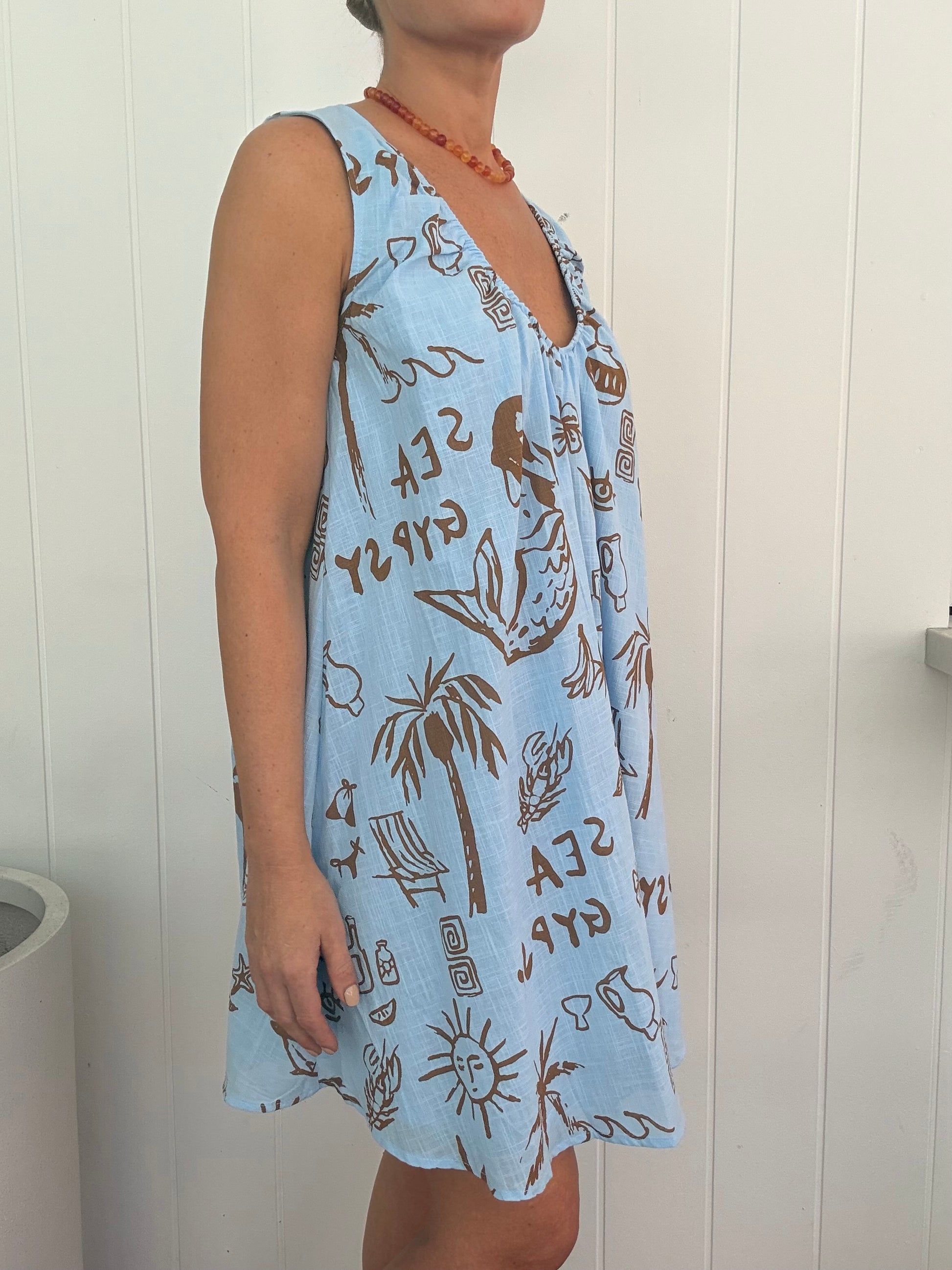 Experience the perfect summer look with By Frankie/ Sea Gypsy's sky Blue Sun dress. Featuring a gathered scoop neckline and lightweight design, this dress is both stylish and comfortable. Stay cool and chic while enjoying the sunny weather in this lined sun dress.