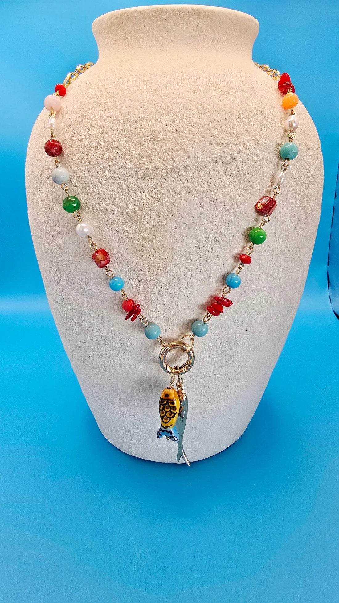 Playful, radiant, and unapologetically Italian. The DOLCE MARE Necklace is a vibrant ode to coastal summers—featuring a joyful mix of turquoise, coral, faux jade, and pearl-like beads, all anchored by a hand-painted fish charm that feels straight from a seaside market in Positano.