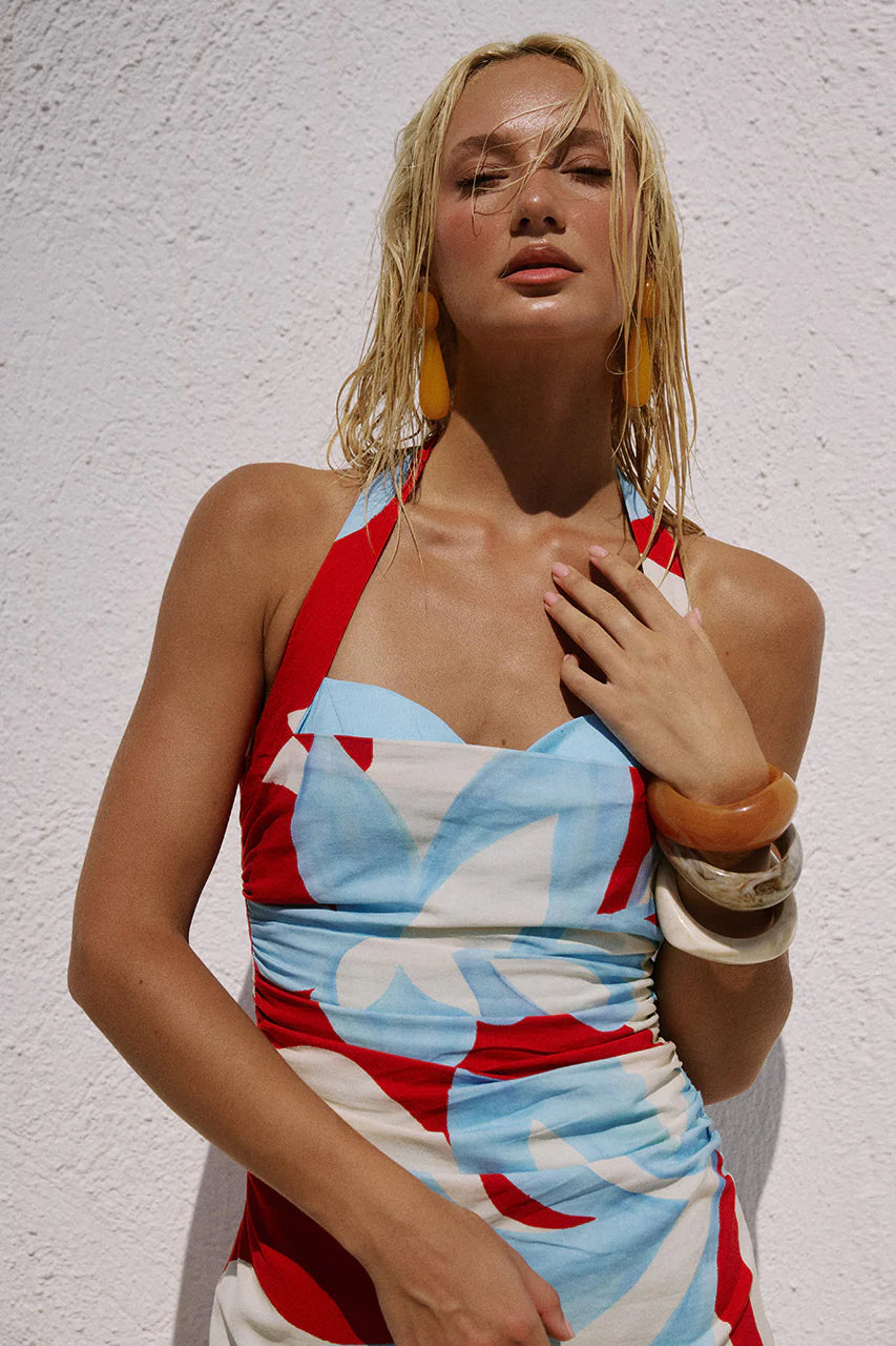 Playful yet refined, the Evie Sweetheart Halter Mini Dress takes you from long lunches to summer evenings in a bold floral print and effortless silhouette.