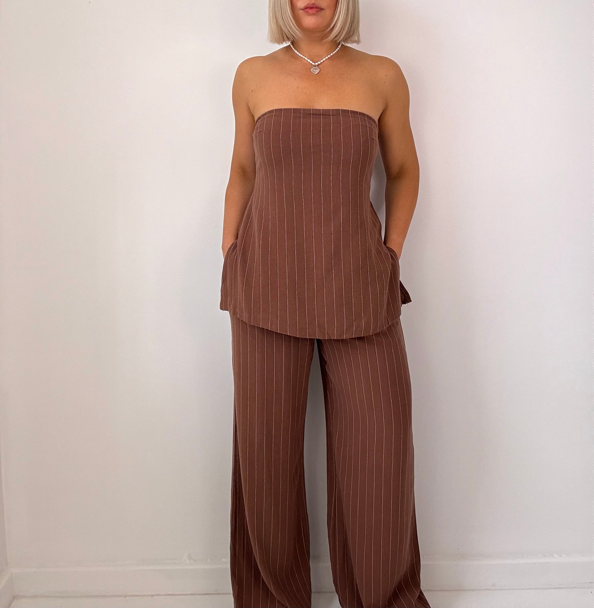 Introducing the Hazel Pant Set in Chocolate, the perfect addition to your wardrobe. Crafted with a longer length boobtube top and pinstriped pants, this set offers a chic and stylish look. Made with soft fabric, it provides both comfort and style. Upgrade your fashion game with this must-have set.