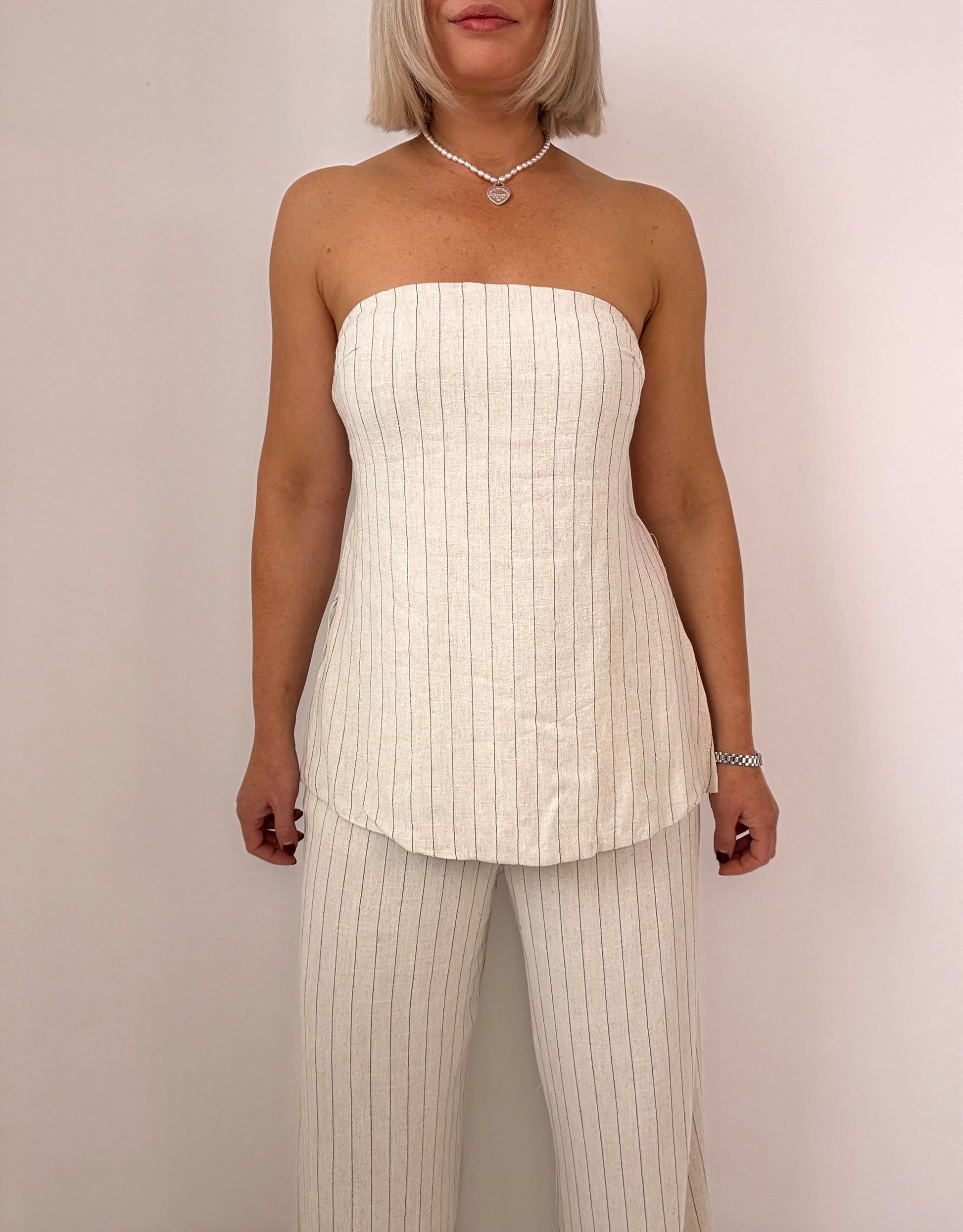 Introducing the Hazel Pant Set in Chocolate, the perfect addition to your wardrobe. Crafted with a longer length boobtube top and pinstriped pants, this set offers a chic and stylish look. Made with soft fabric, it provides both comfort and style. Upgrade your fashion game with this must-have set.