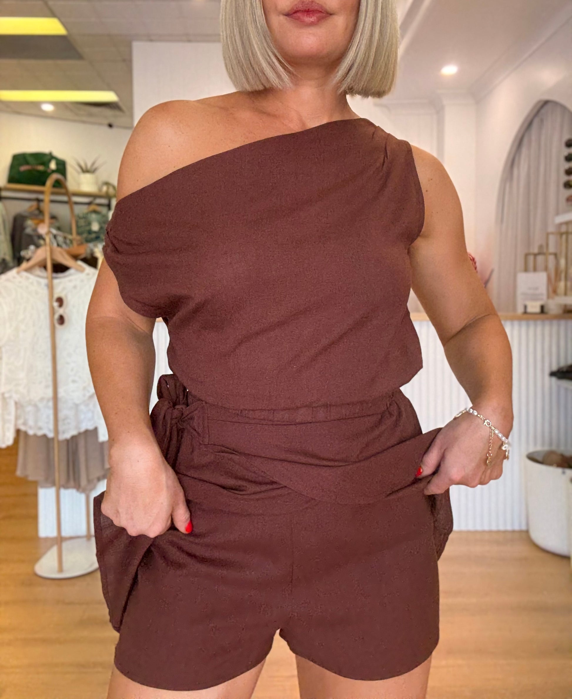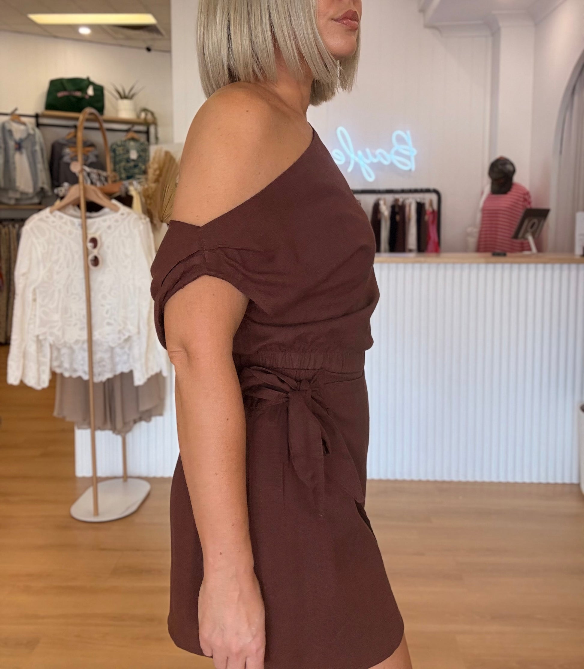 The Kyra Skort set in Choc is a versatile and fashionable addition to any wardrobe. Made from high-quality linen, this set features an off-shoulder elastic waist top that can be worn in a cropped style or paired with the included skort. The skort offers a button-up closure and elastic back, providing both comfort and style with shorts and a skirt. Elevate your look with this simply stylish ensemble.