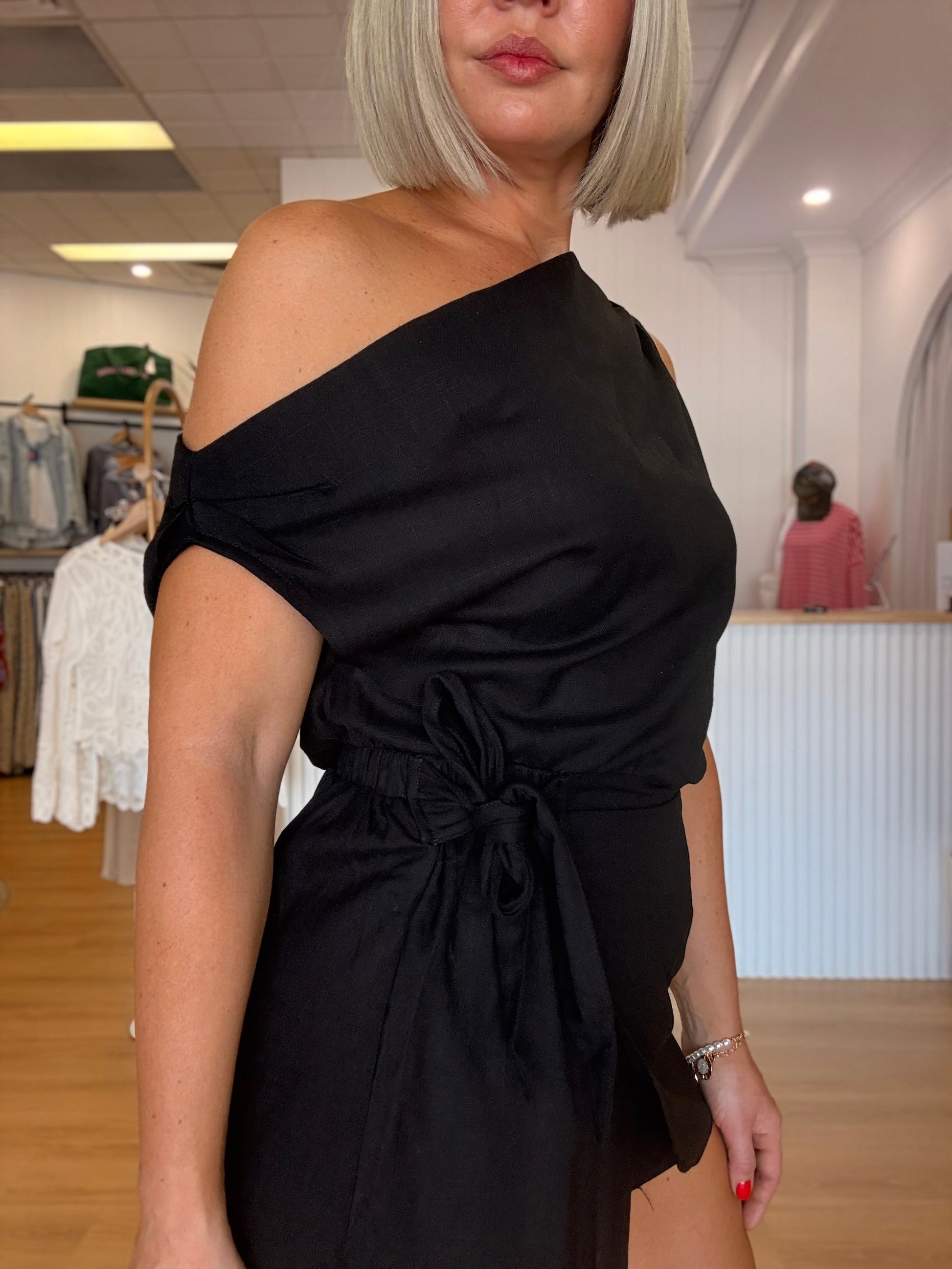The Kyra Skort set in black is a versatile and fashionable addition to any wardrobe. Made from high-quality linen, this set features an off-shoulder elastic waist top that can be worn in a cropped style or paired with the included skort. The skort offers a button-up closure and elastic back, providing both comfort and style with shorts and a skirt. Elevate your look with this simply stylish ensemble.