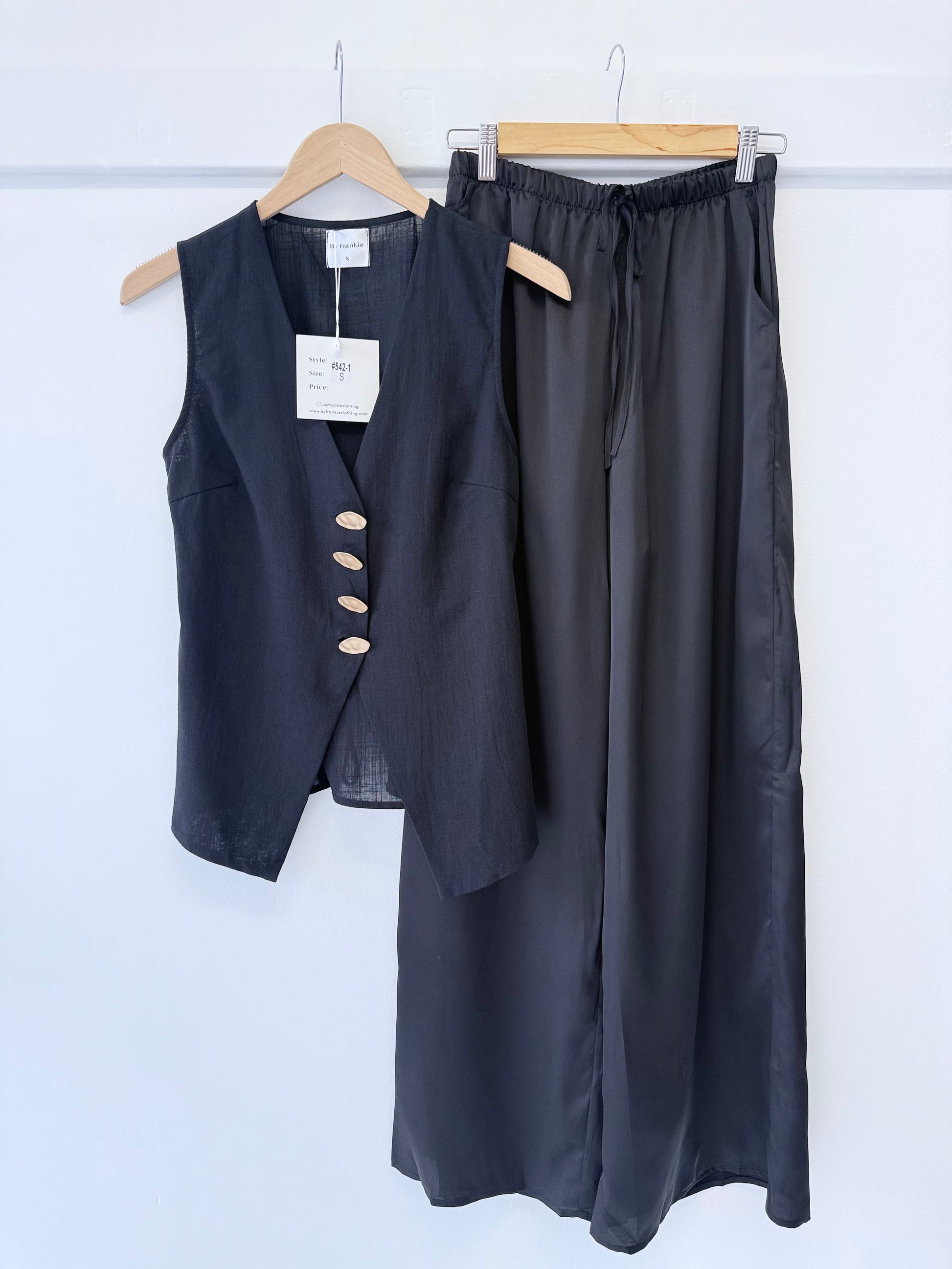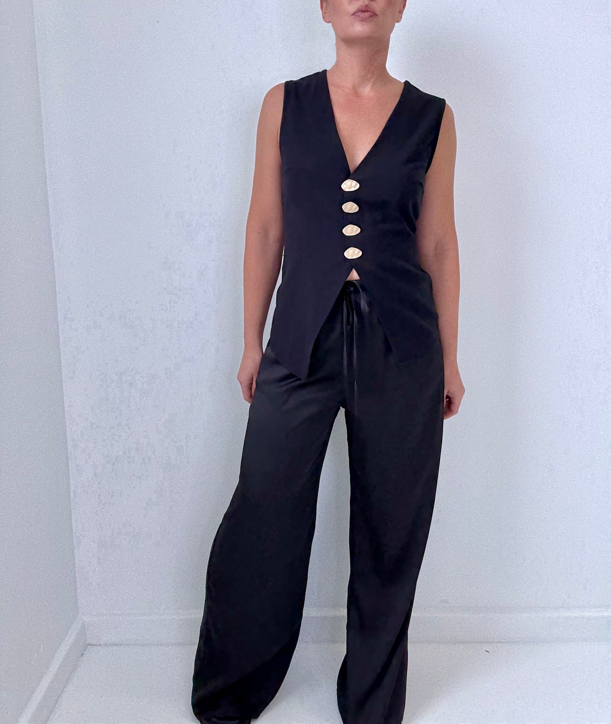 Enhance your wardrobe with this Luna vest set, featuring a structured vest with a tie back detail for a flattering silhouette and wide leg satin pants for a touch of elegance. This stunning set is perfect for any occasion, offering both style and comfort in one.