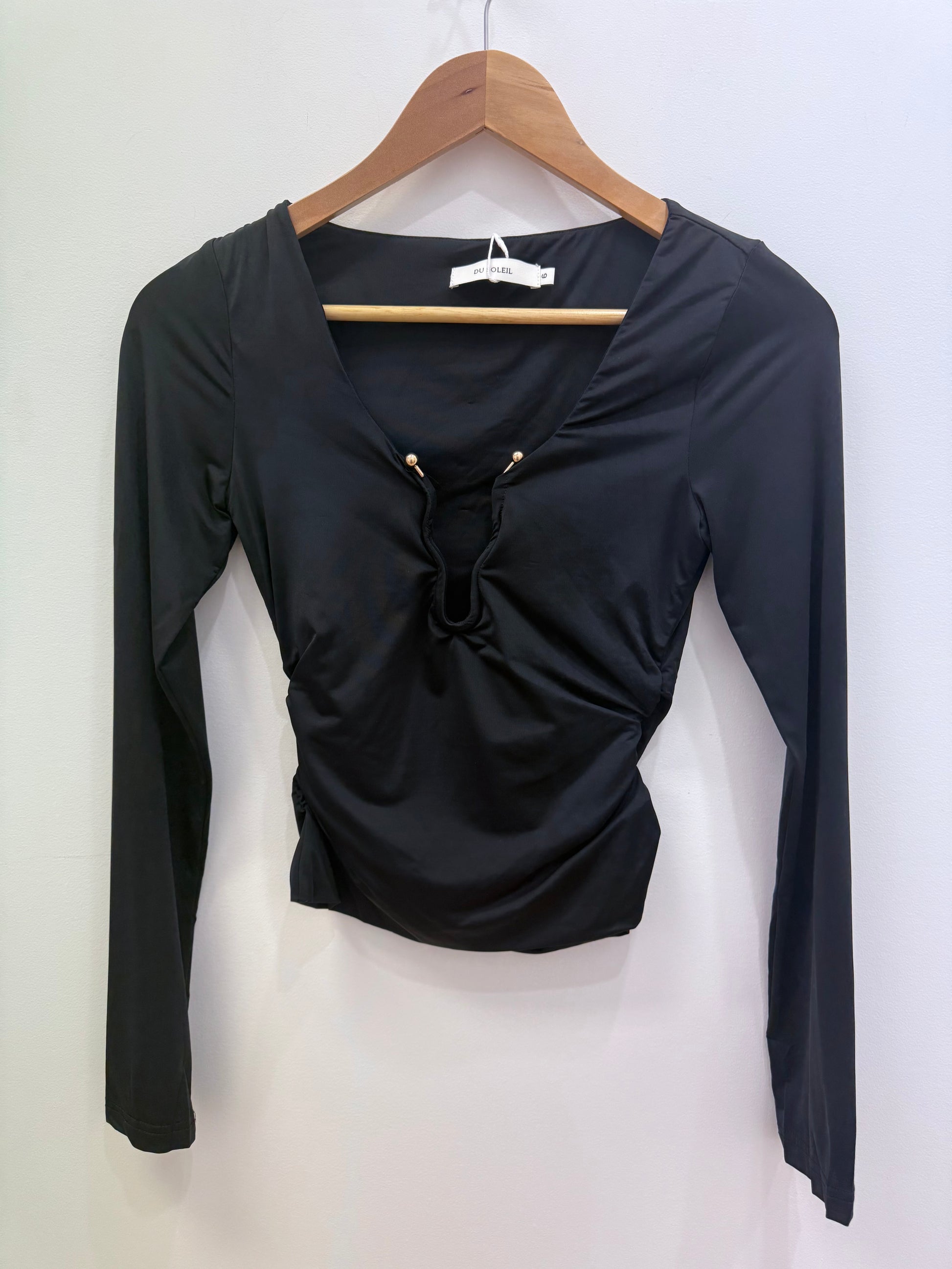 Expertly crafted with a gold wave detail v neck and long sleeves, the Maya long sleeve in black promises a sleek and sophisticated look. Made with buttery soft fabric, you'll love the comfortable and luxurious feel of this top. Perfect for any occasion, elevate your style with Mya.