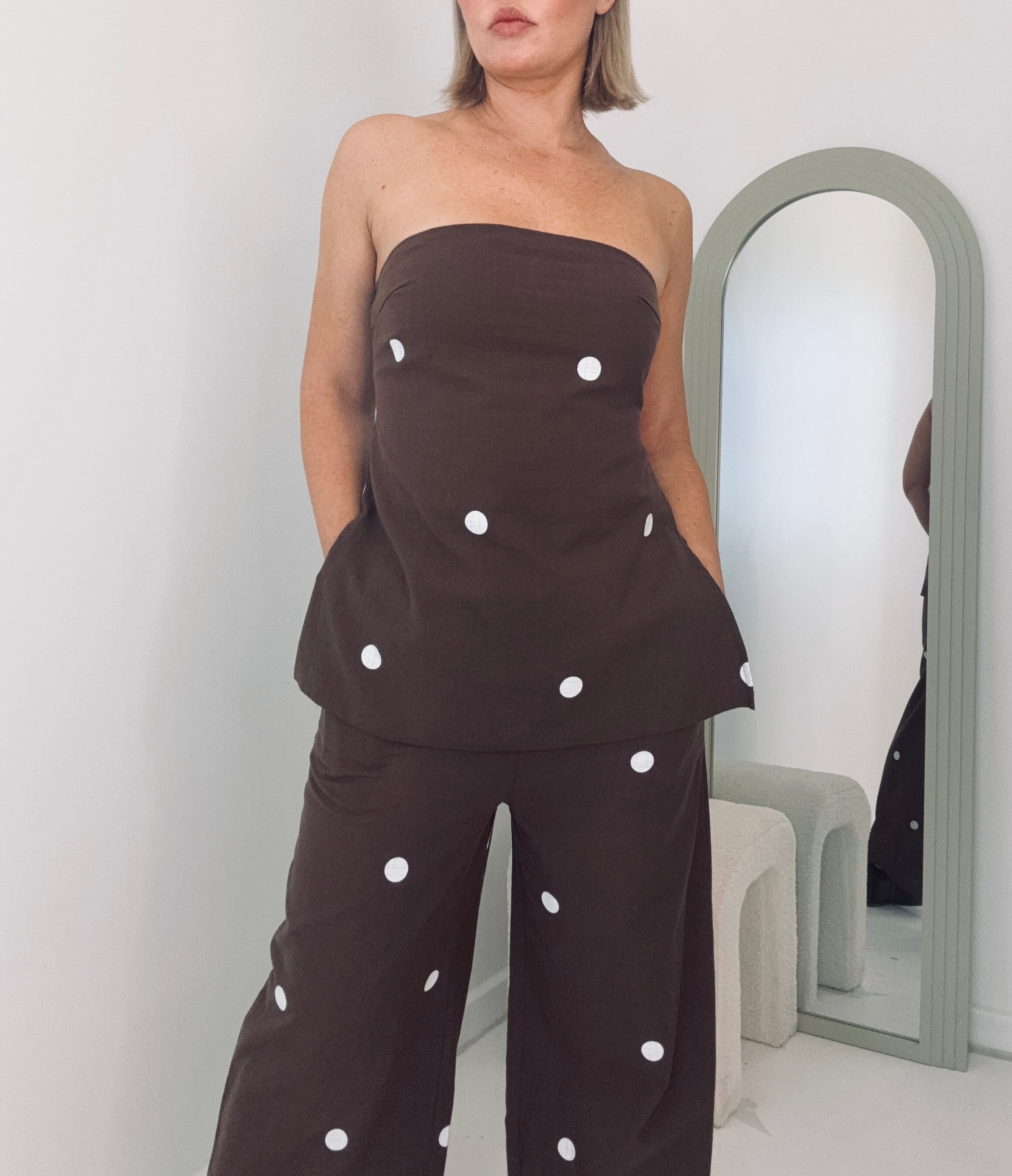 Effortlessly stylish and comfortable, the Sophia Pant Set in beautiful chocolate linen is a must-have. The strapless top features an elastic back for the perfect fit, while the lightweight pants come with pockets and an elastic waistband. A versatile and chic addition to your wardrobe.
