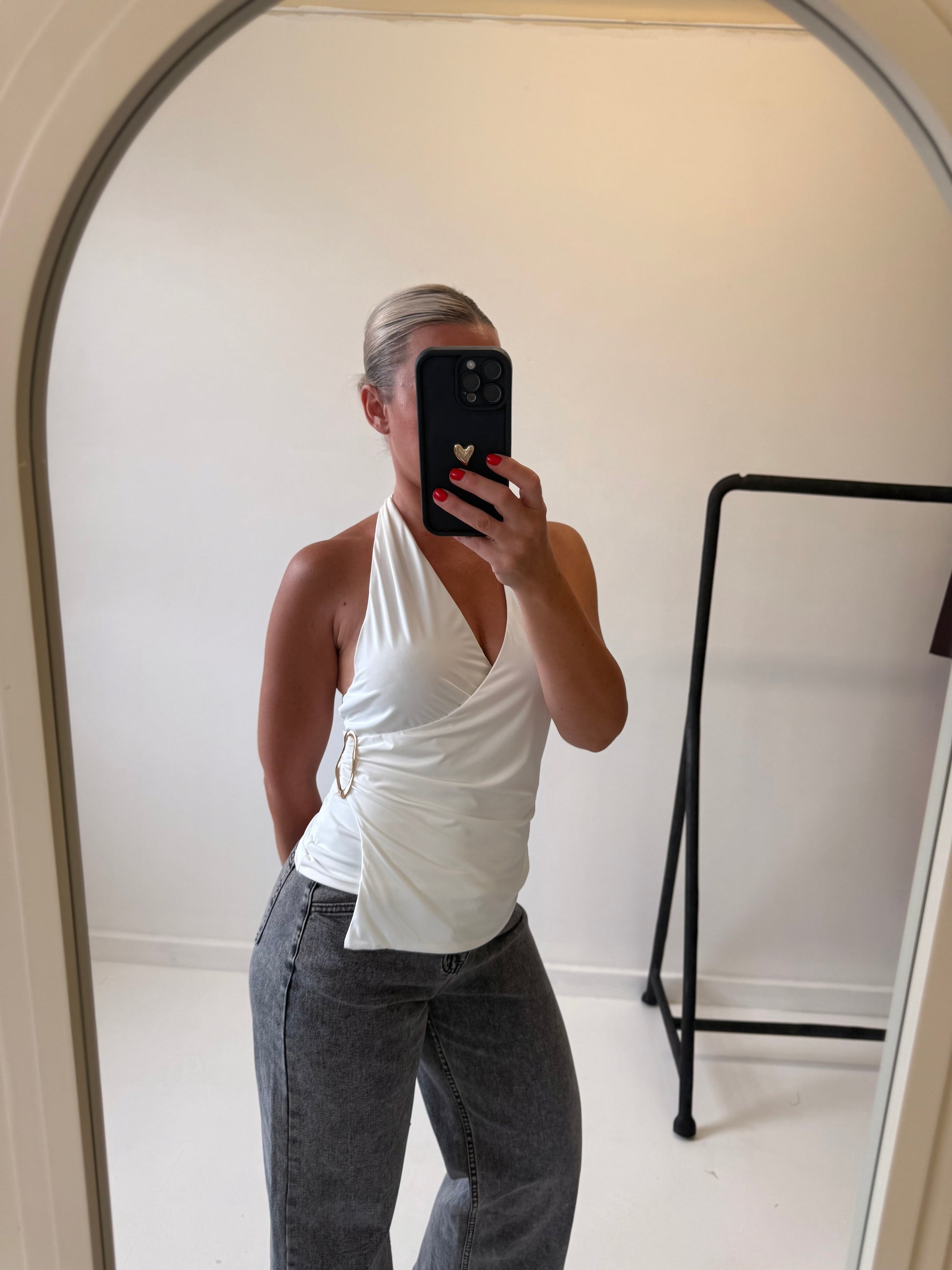 Expertly crafted with a unique wrap top design, the Sophia halter exudes effortless sophistication. The addition of a stunning brooch clip detail elevates this piece, creating a versatile and stylish addition to any wardrobe. Perfect for adding a touch of elegance to any outfit.
