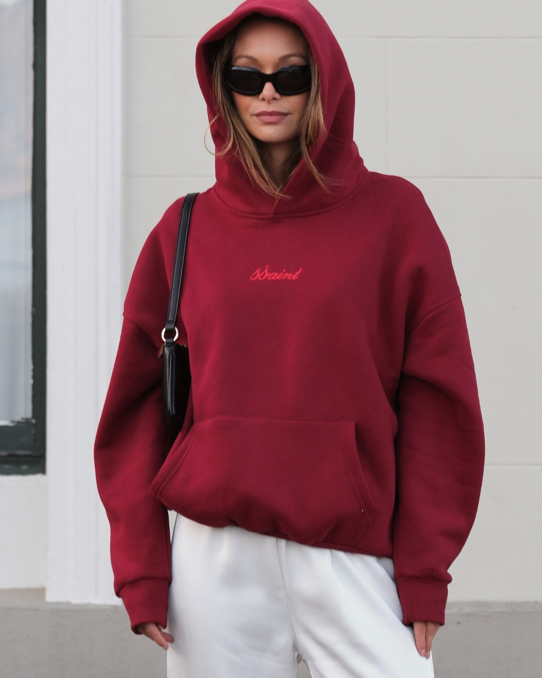 ŚAINT Logo Hoodie Cherry Elevated minimalism meets everyday comfort. The SŚAINT Logo Hoodie in Cherry features a premium cotton-polyester blend, offering a soft yet durable feel perfect for daily wear. Designed with a relaxed, unisex fit and clean lines, it’s finished with the signature SŚAINT logo printed in a subtle, lighter Cherry tone for understated impact.