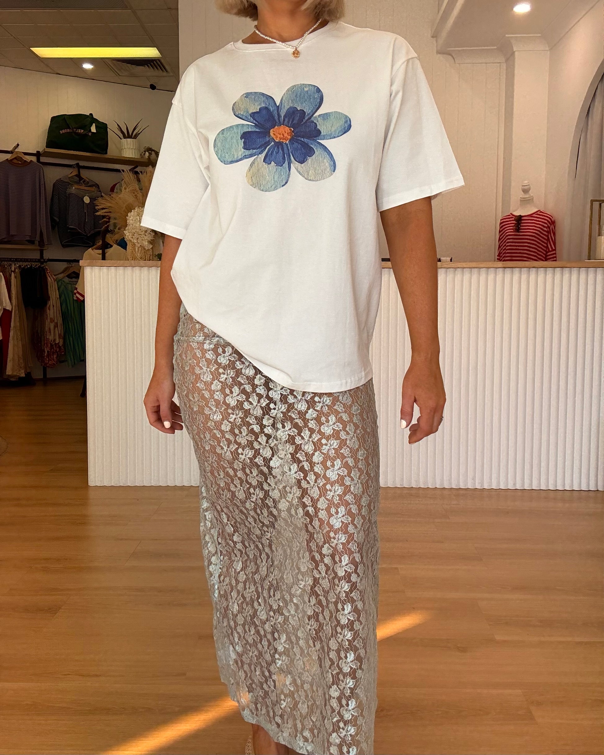 Effortlessly elevate your summer wardrobe with our Summer Lace skirt. Made with a metallic sheer lace fabric, this straight maxi style skirt adds a touch of shine to any outfit. Featuring a side zip, it's easy to style with any tee or linen top for a dressed-up look. Transform your look with this versatile and chic piece.