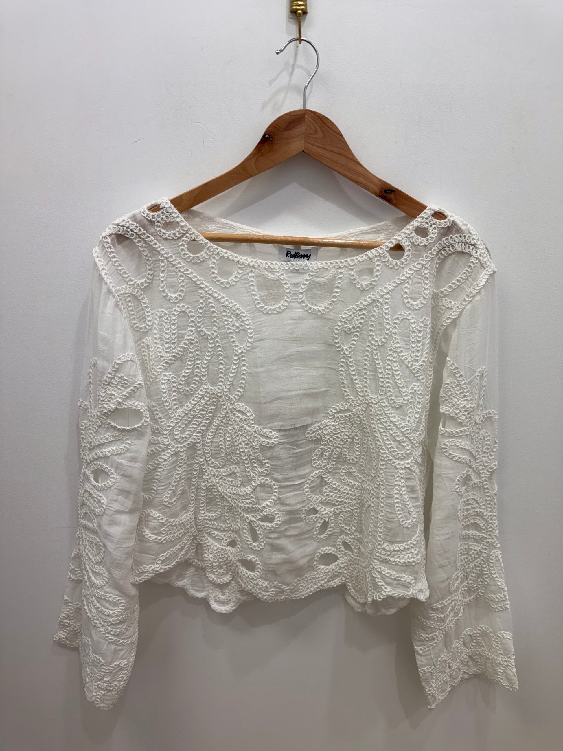 The Zara Cropped Crochet Blouse. Made with intricate crochet detailing, this crop top is perfect for those warm weather days. Crafted from a lightweight fabric, it's both beautiful and comfortable. A must-have addition to any wardrobe.